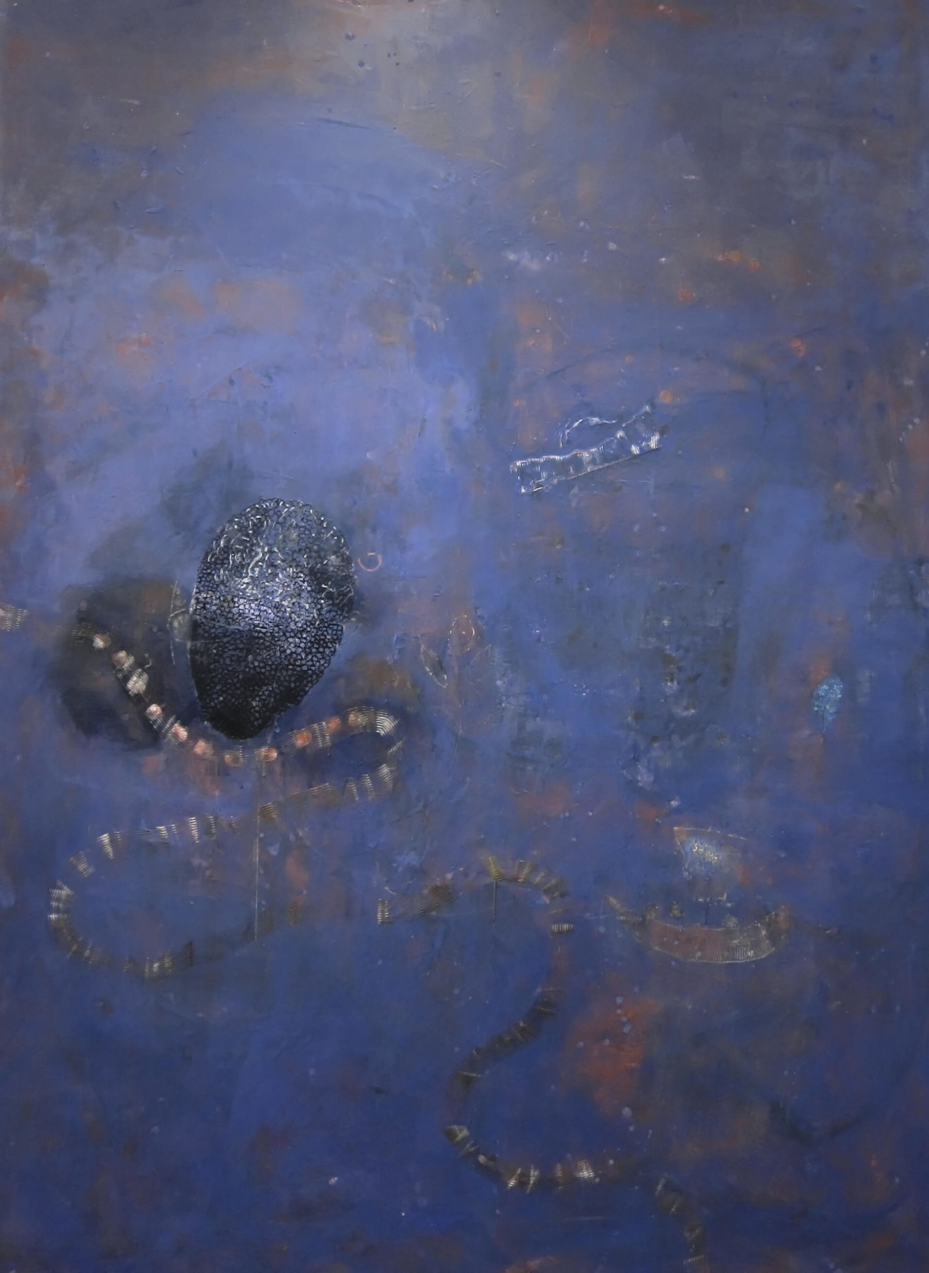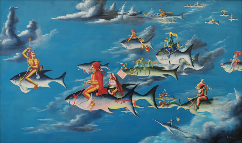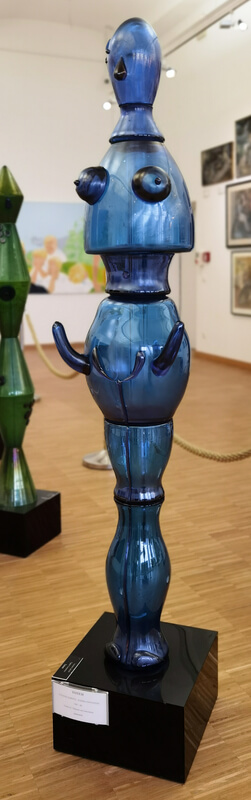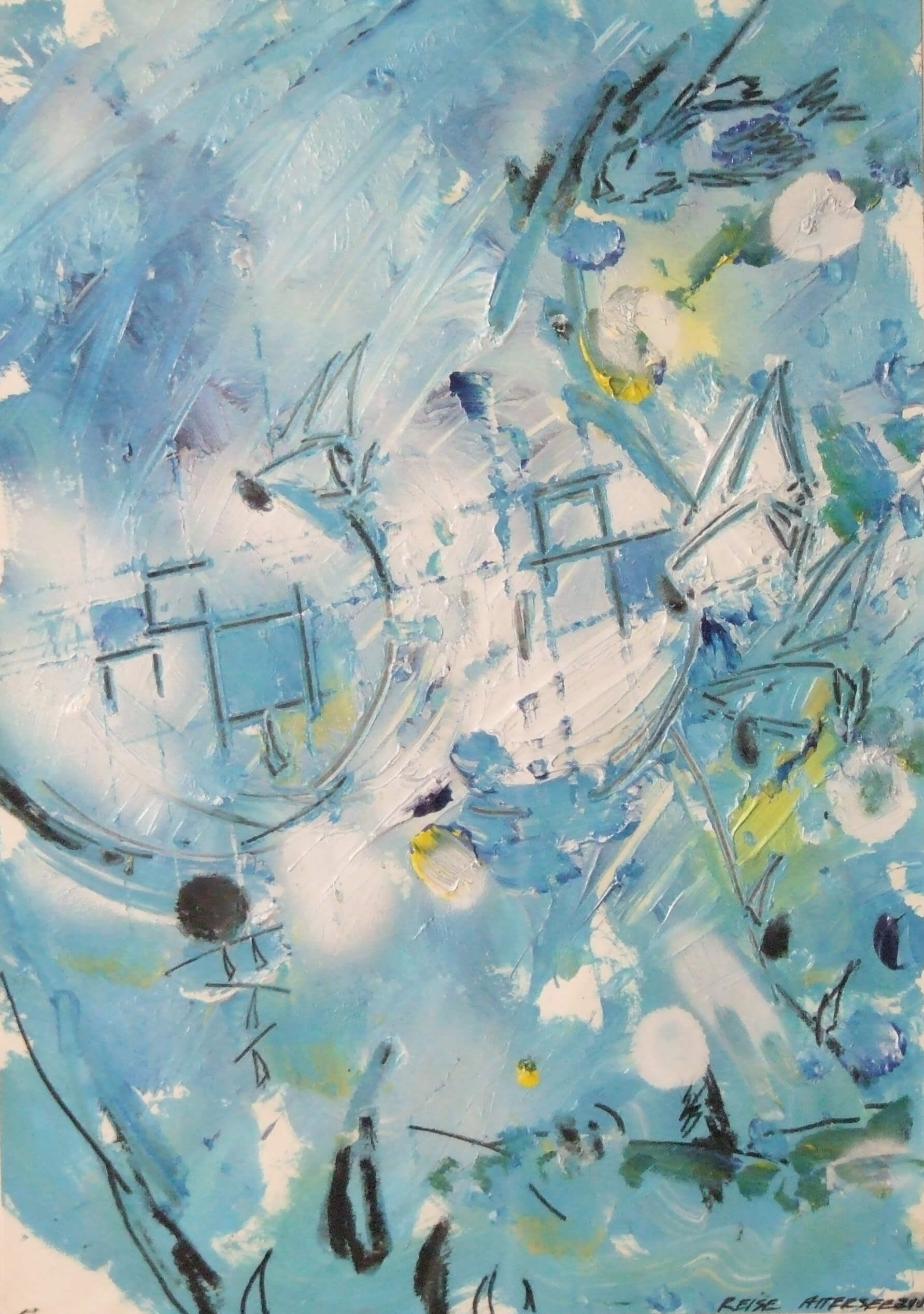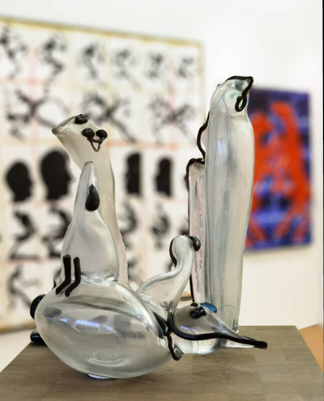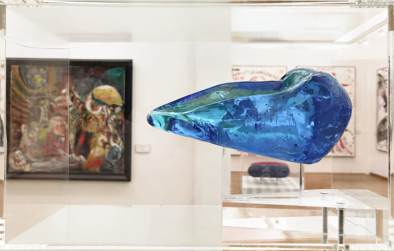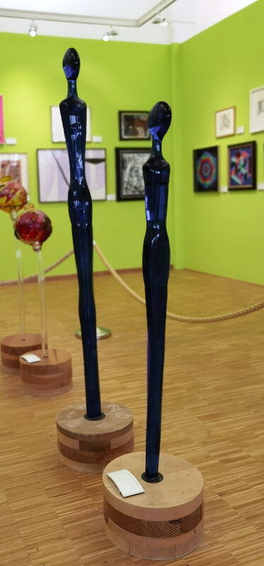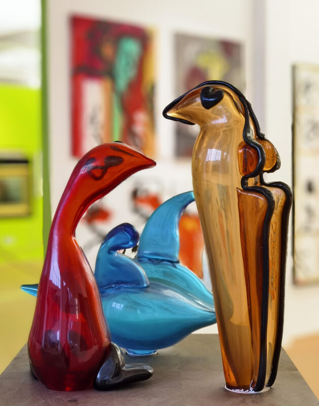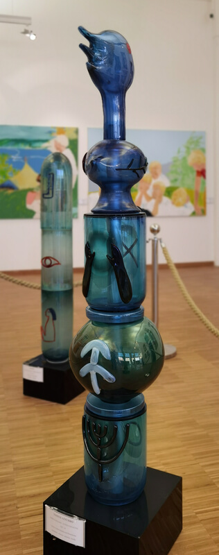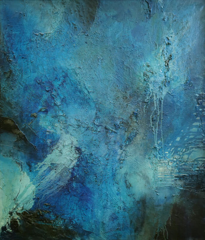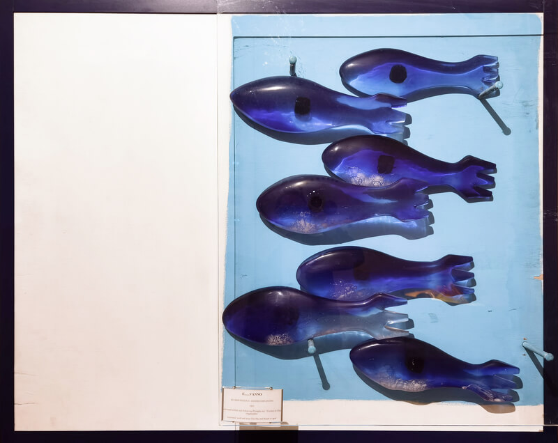 Glasobjekt | Leinwand in Holz mit Schutz aus Plexiglas mit 7 Fischen in glas eingebunden, Leinwand weiß und azur, Glas blau mit Rauch in opal Format: cm