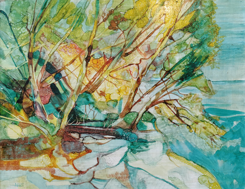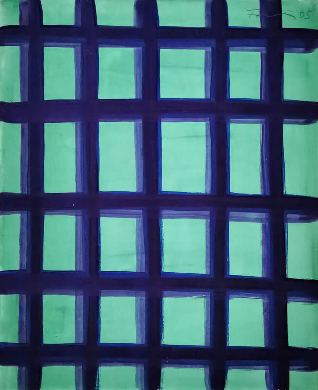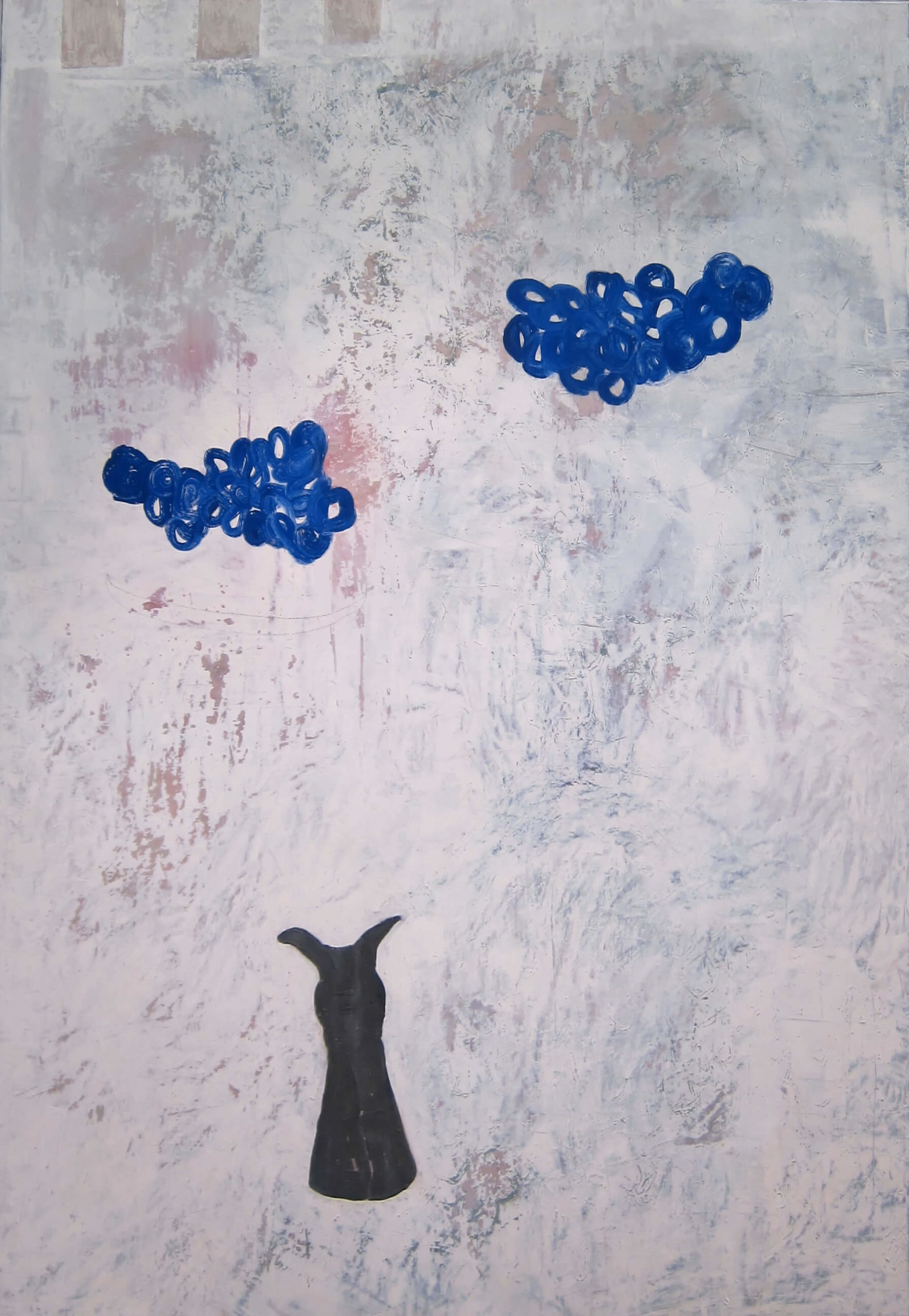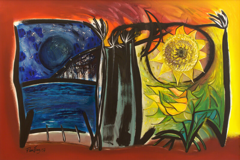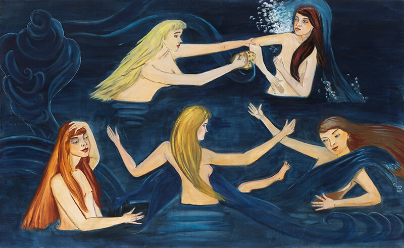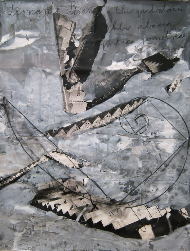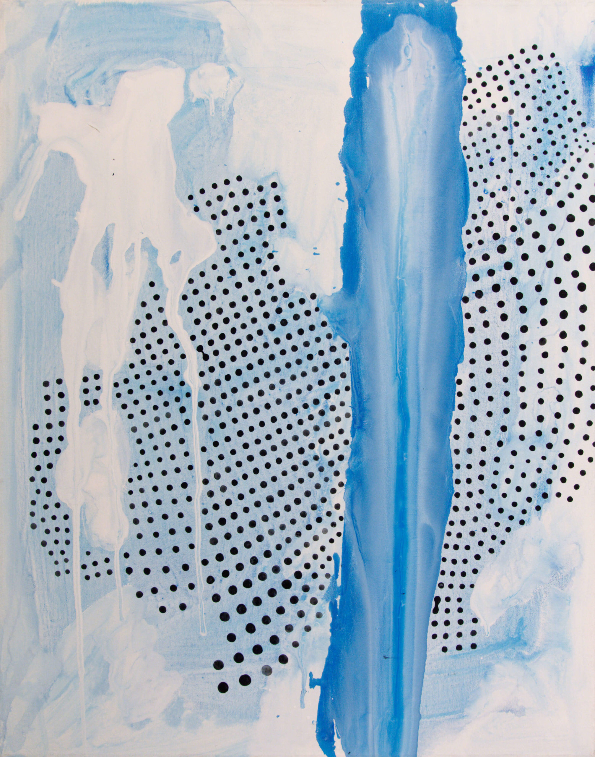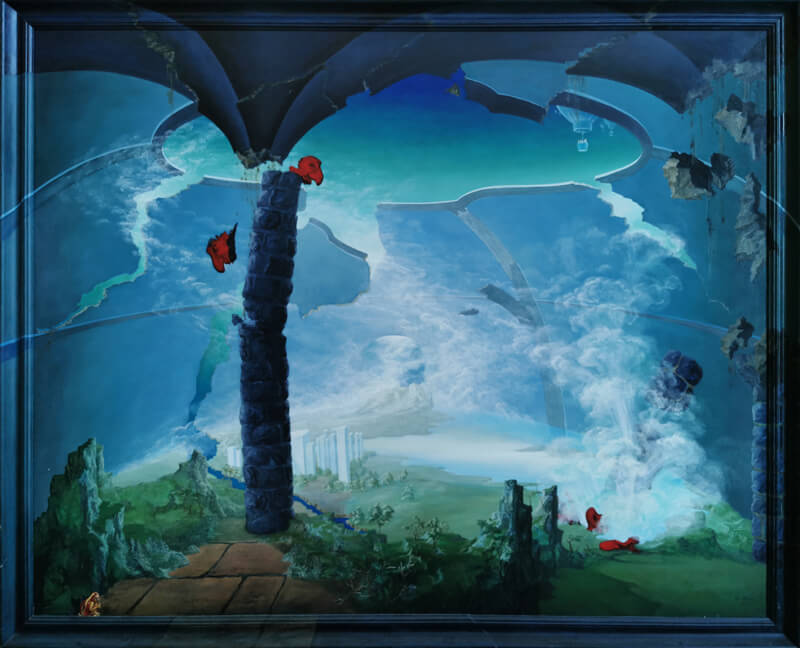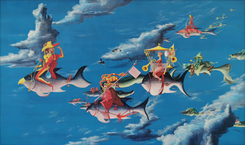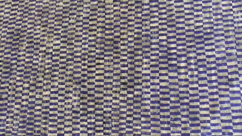 Glasobjekt | Leinwand in Holz mit Schutz aus Plexiglas mit 7 Fischen in glas eingebunden, Leinwand weiß und azur, Glas blau mit Rauch in opal Format: cm