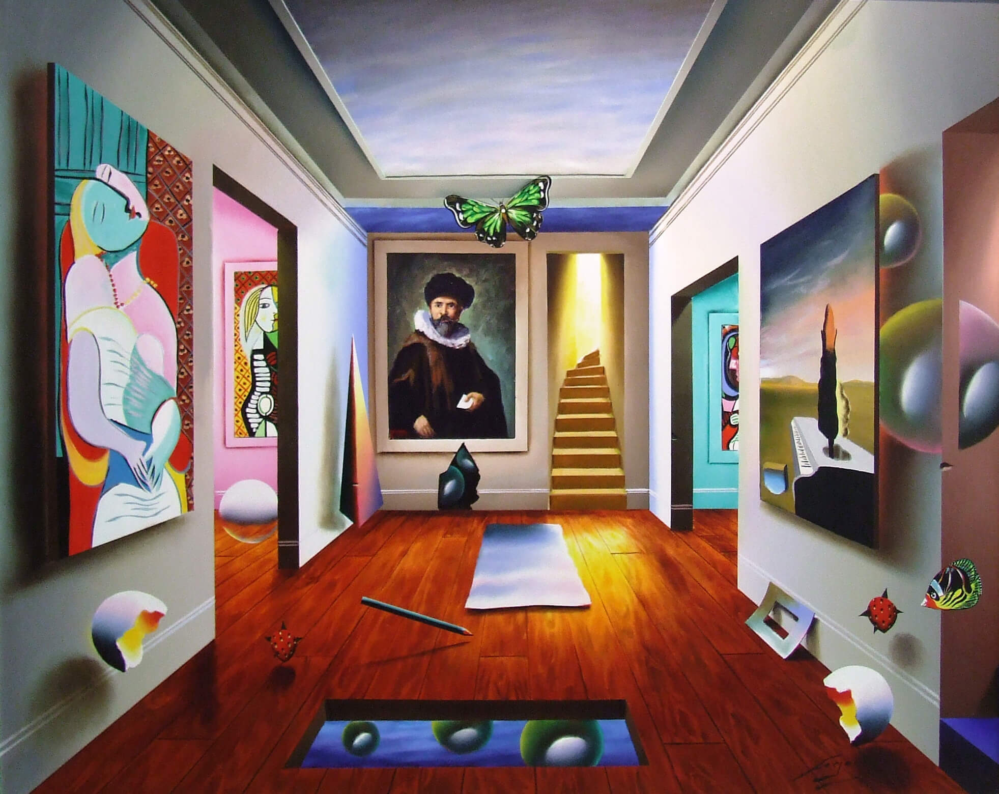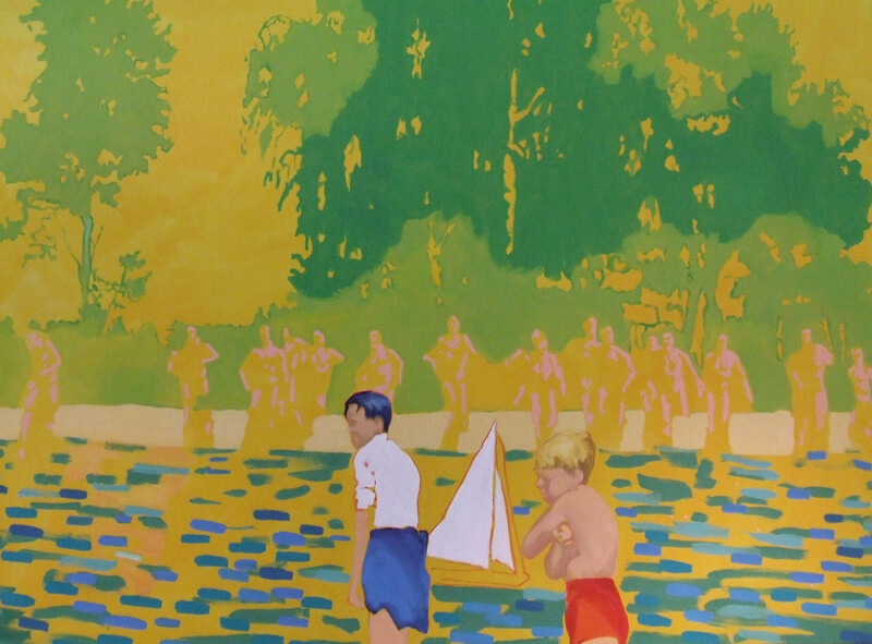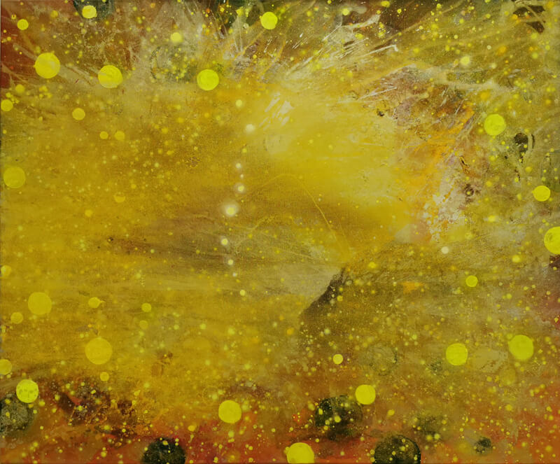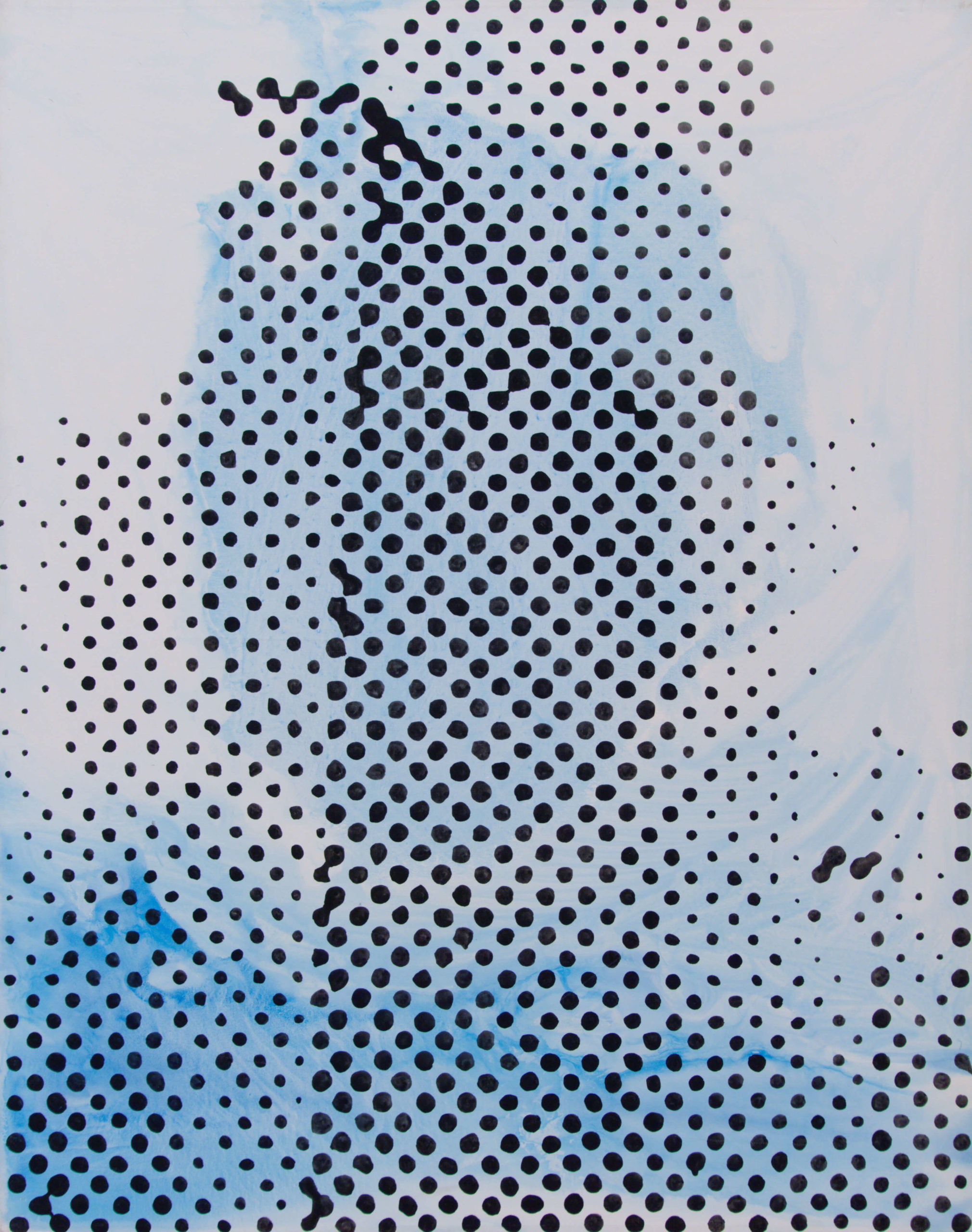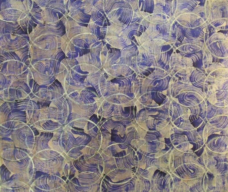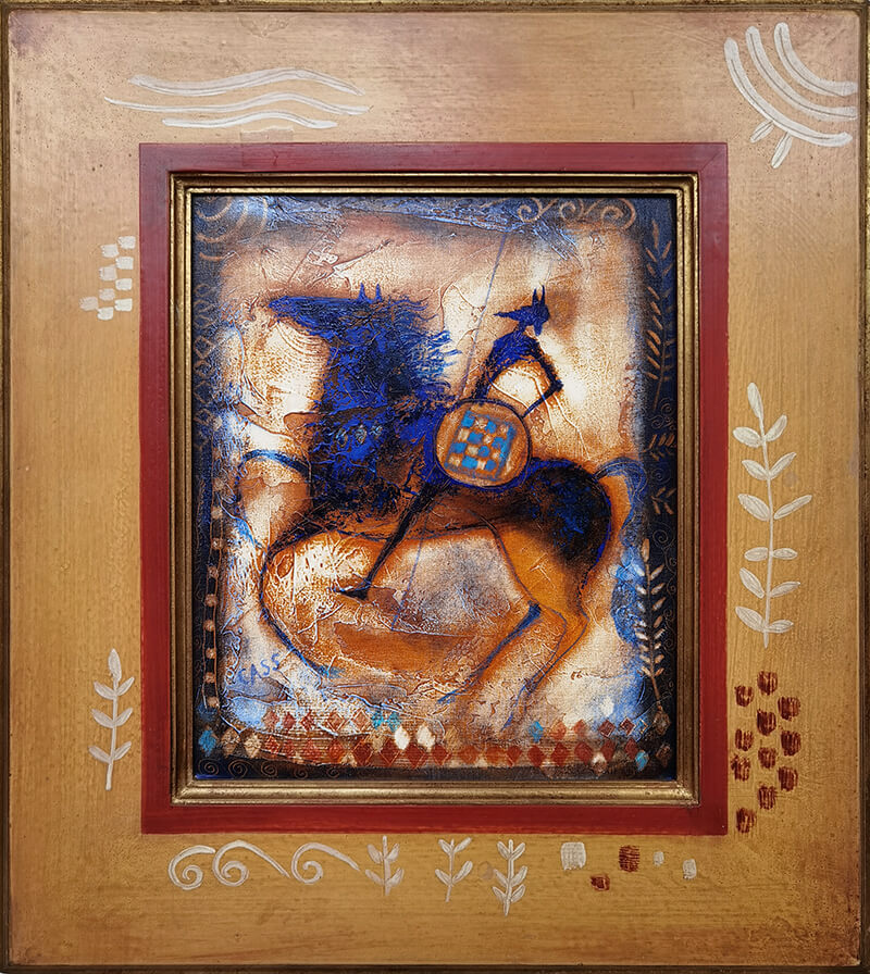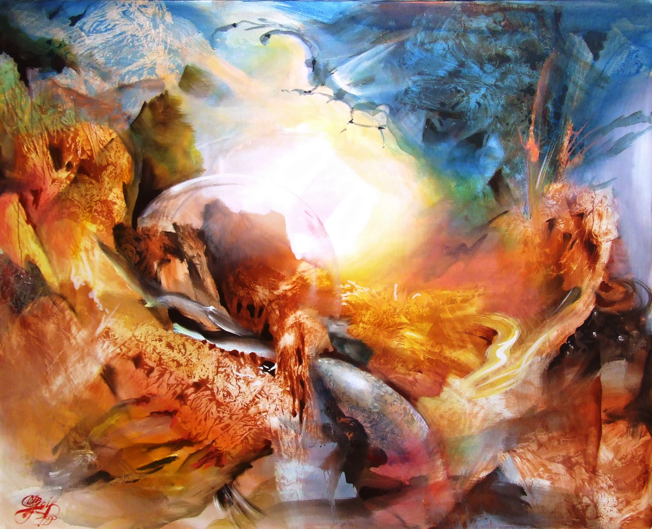 Glasobjekt | Leinwand in Holz mit Schutz aus Plexiglas mit 7 Fischen in glas eingebunden, Leinwand weiß und azur, Glas blau mit Rauch in opal Format: cm