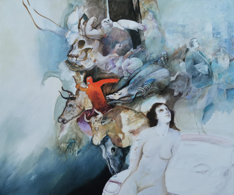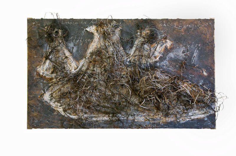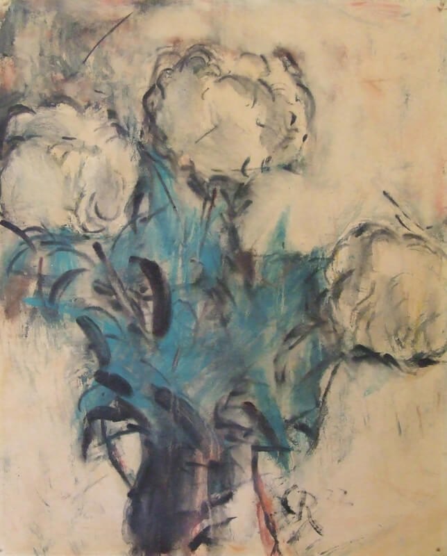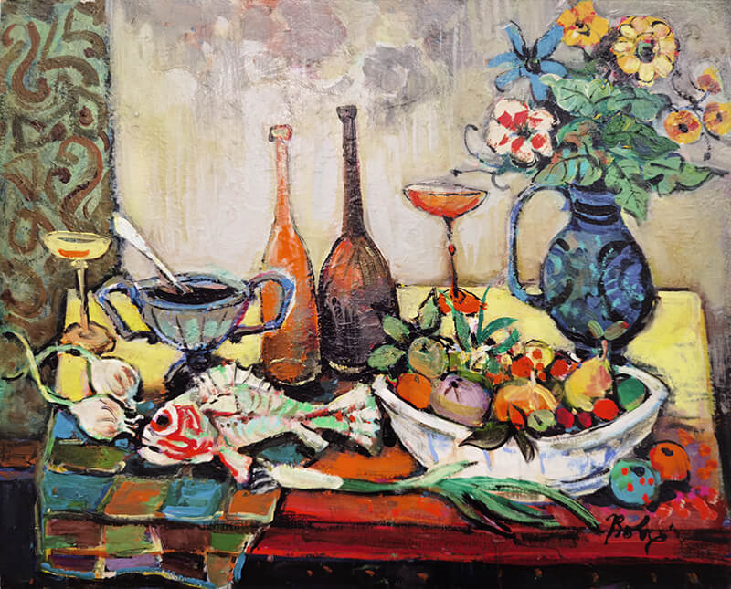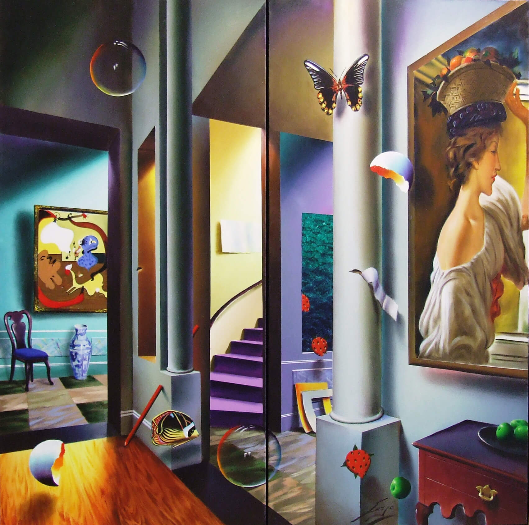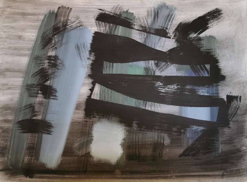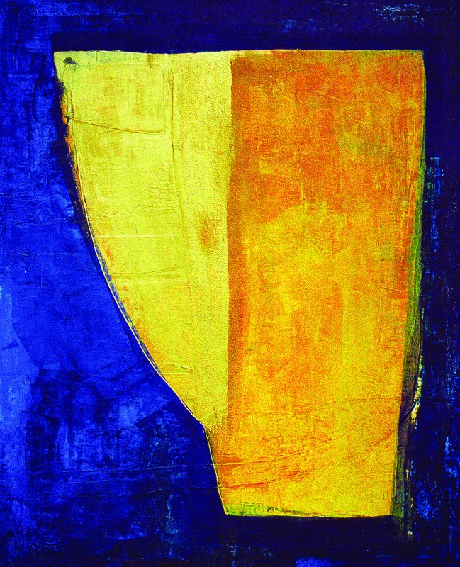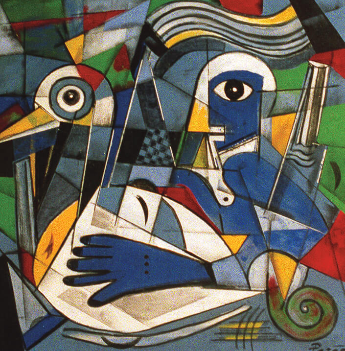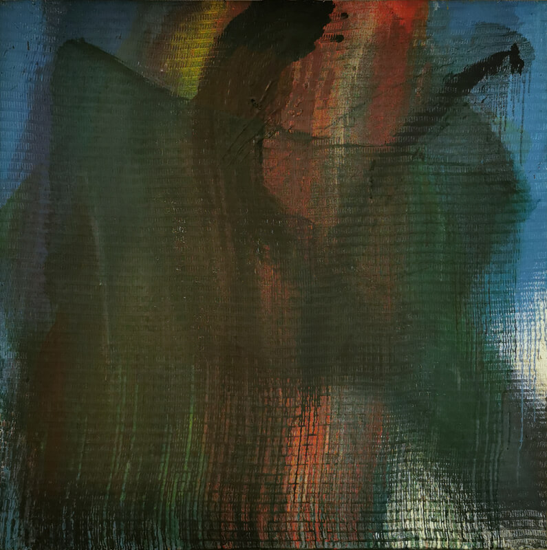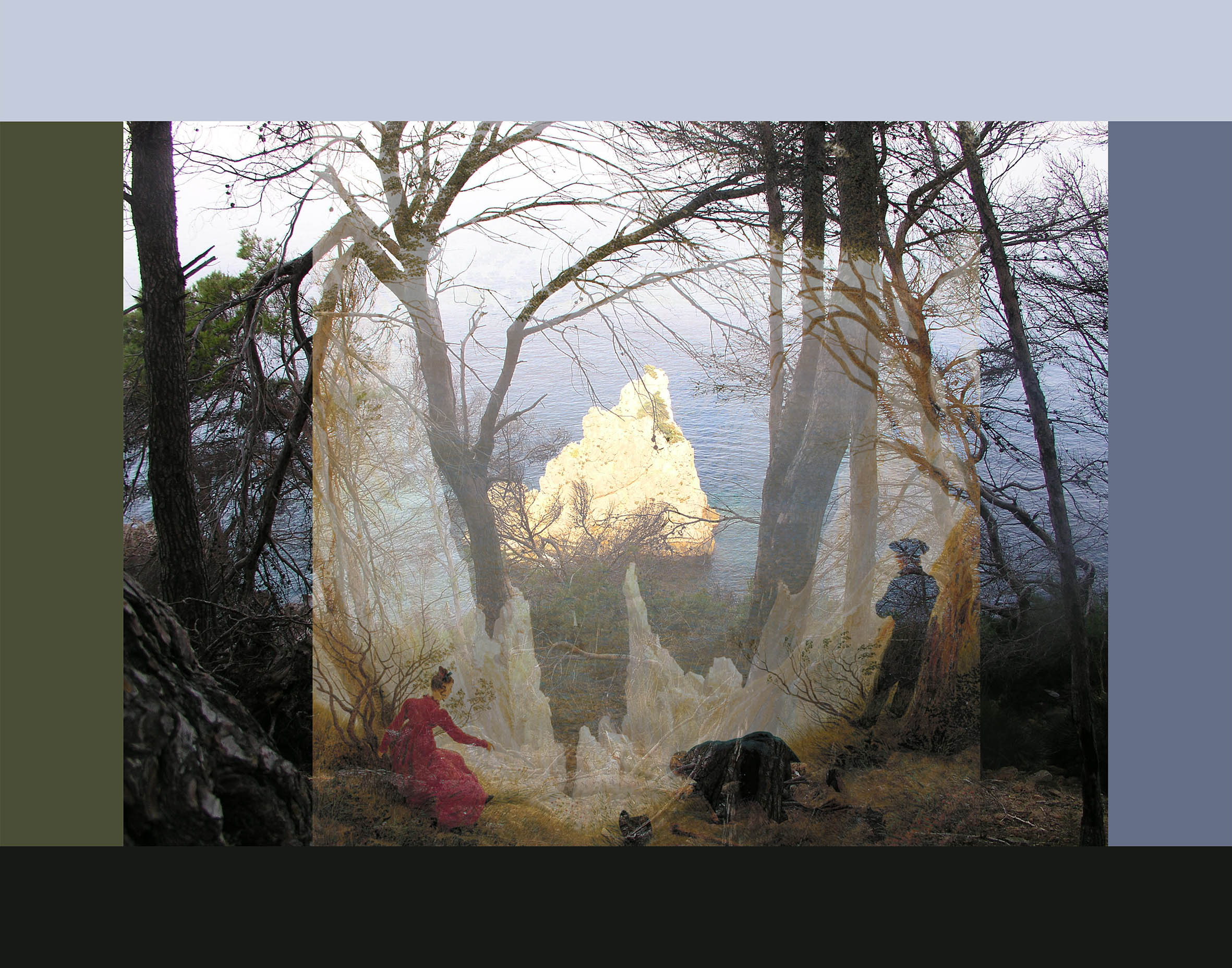 Glasobjekt | Leinwand in Holz mit Schutz aus Plexiglas mit 7 Fischen in glas eingebunden, Leinwand weiß und azur, Glas blau mit Rauch in opal Format: cm