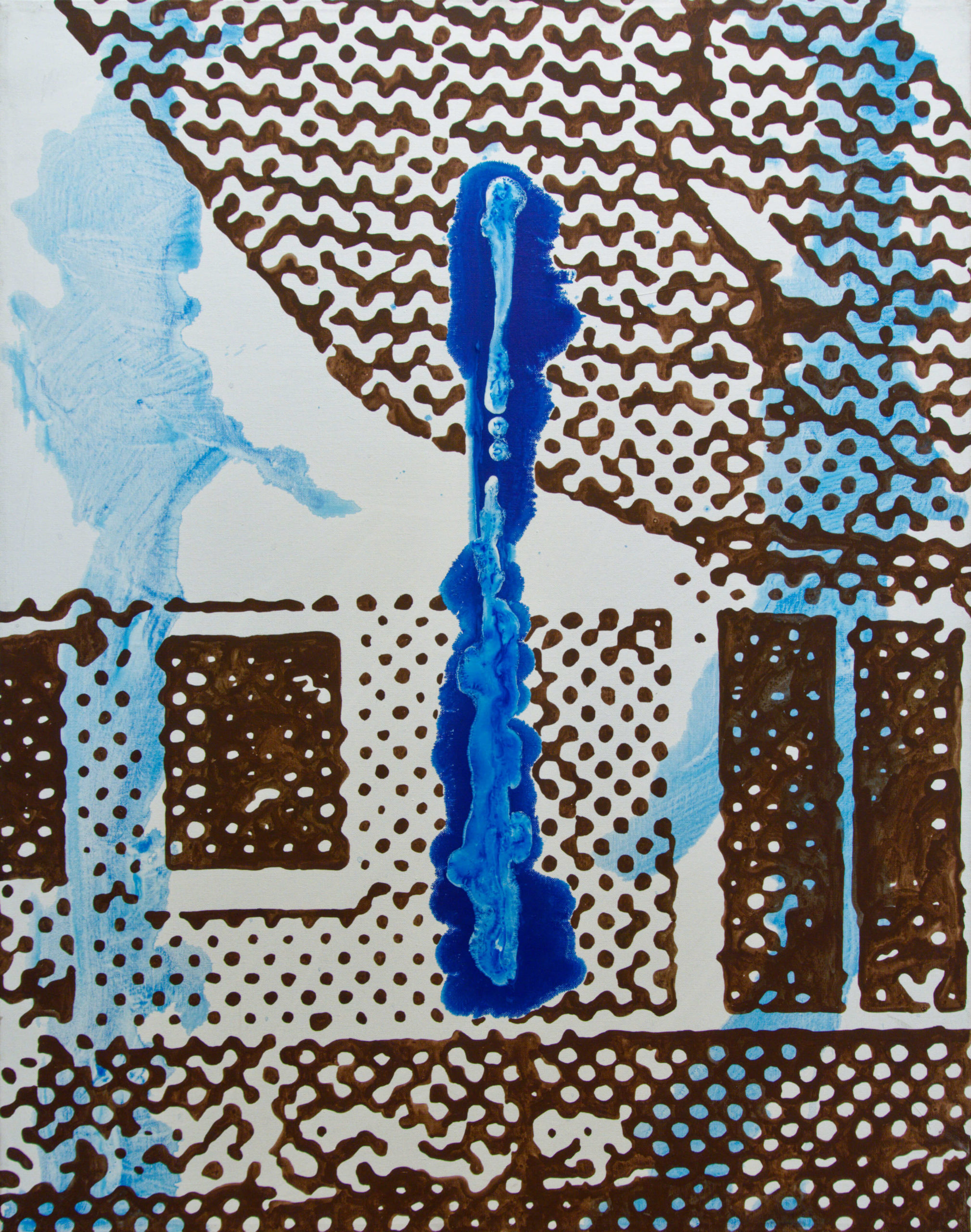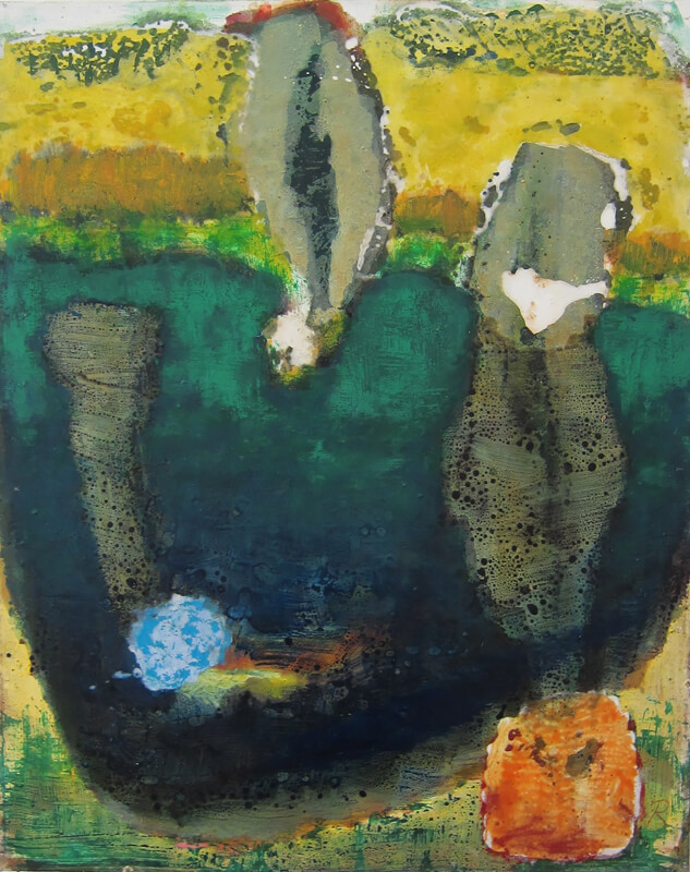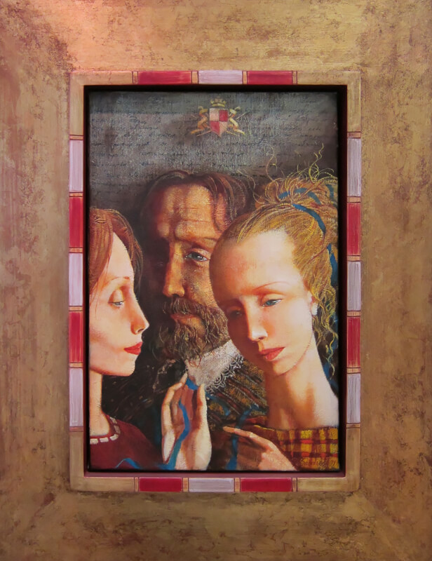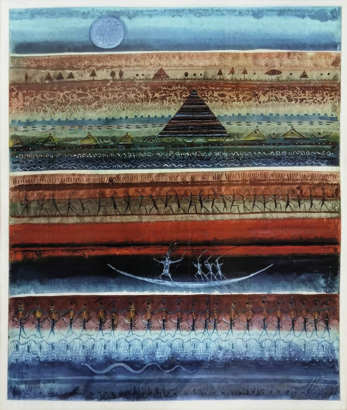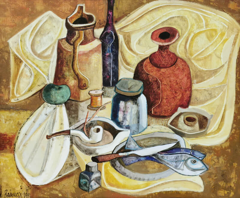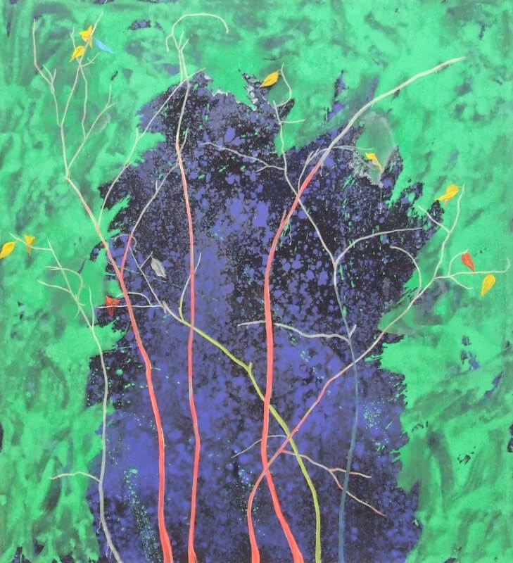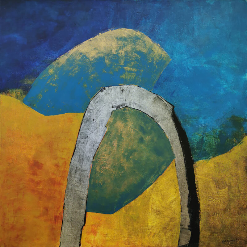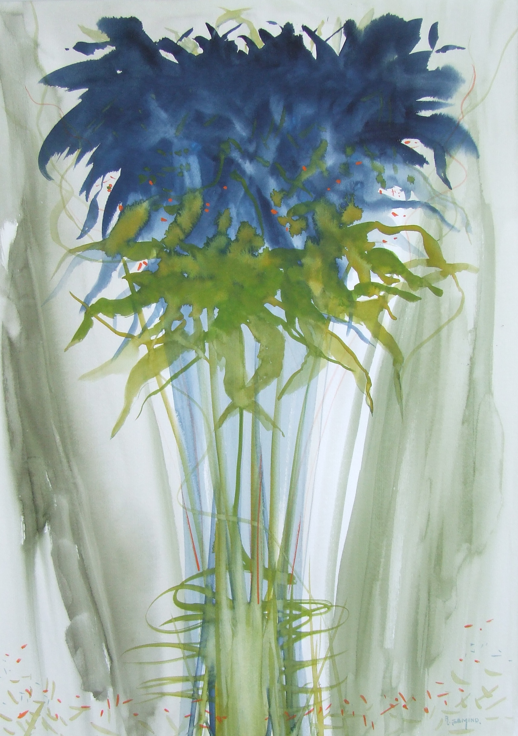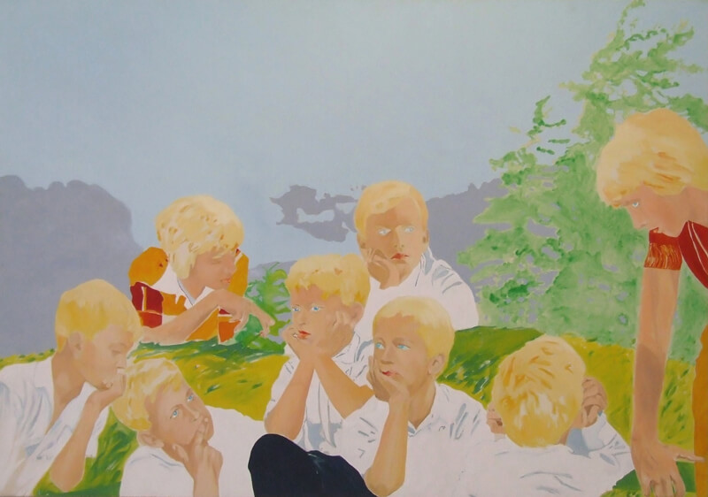 Glasobjekt | Leinwand in Holz mit Schutz aus Plexiglas mit 7 Fischen in glas eingebunden, Leinwand weiß und azur, Glas blau mit Rauch in opal Format: cm