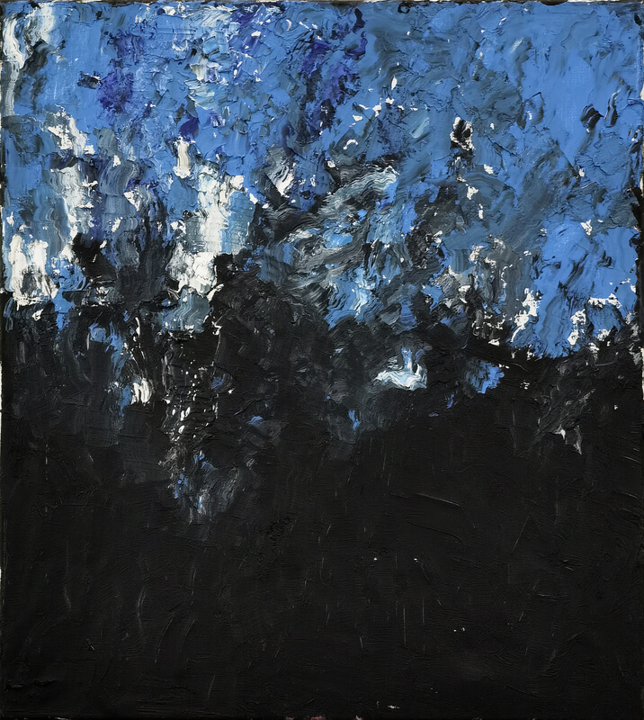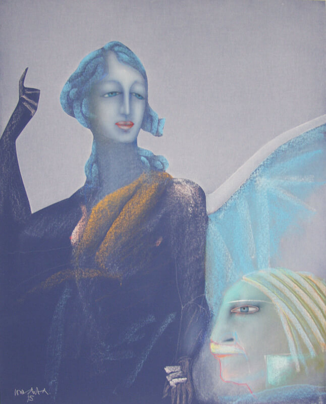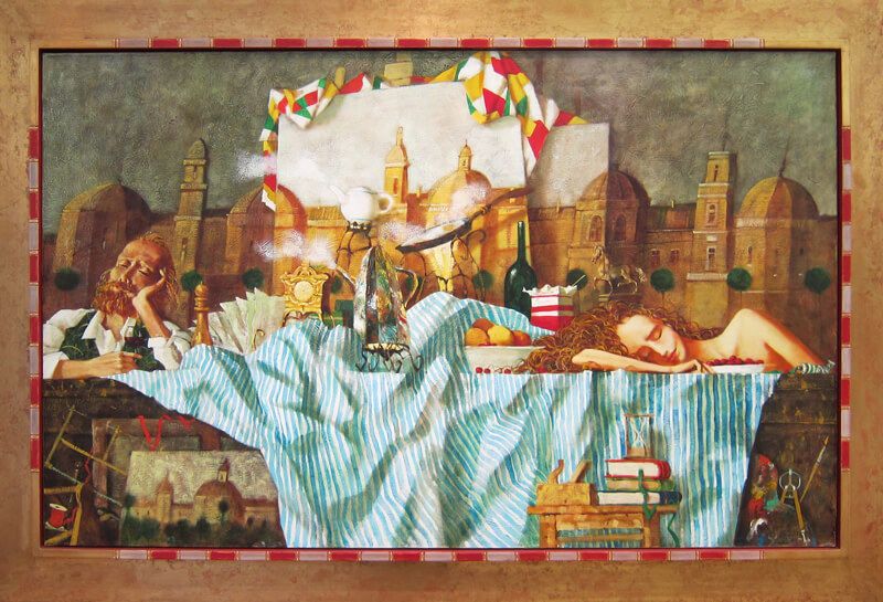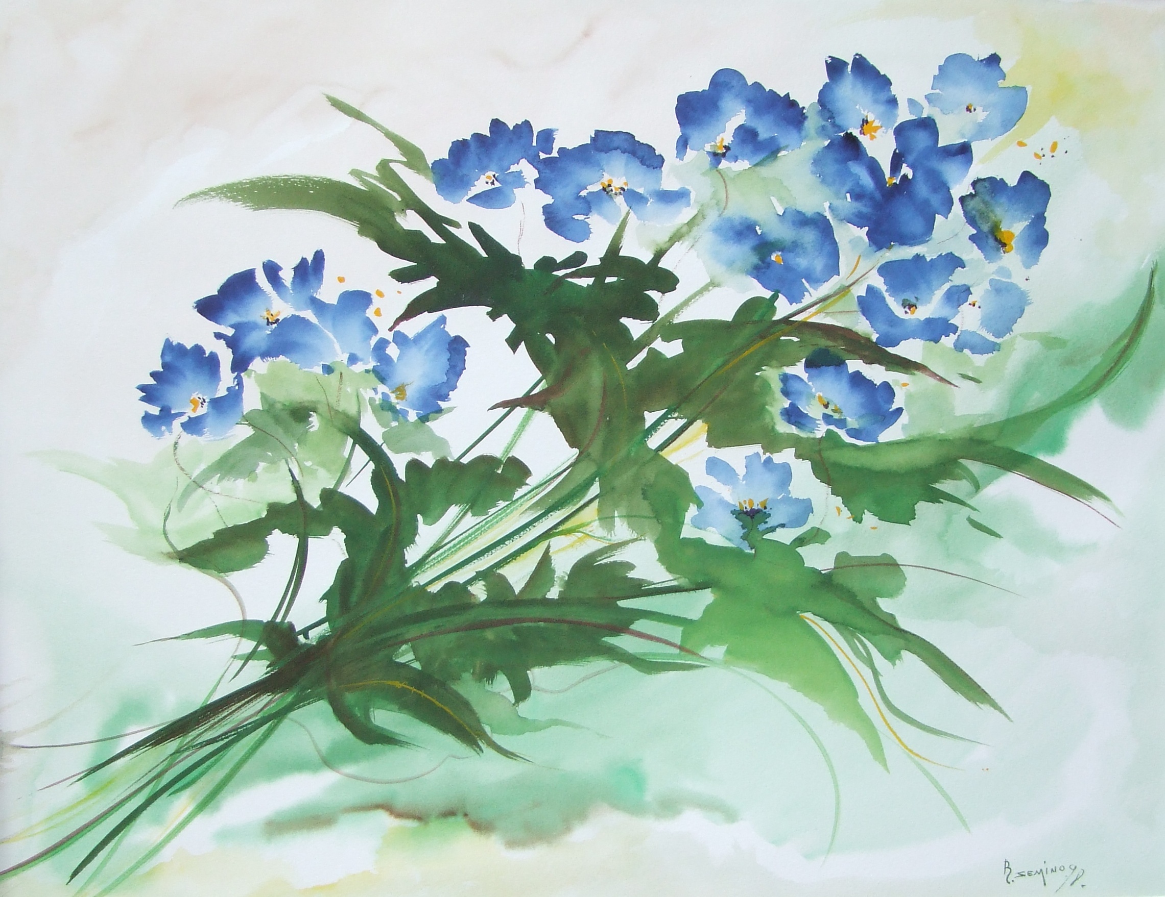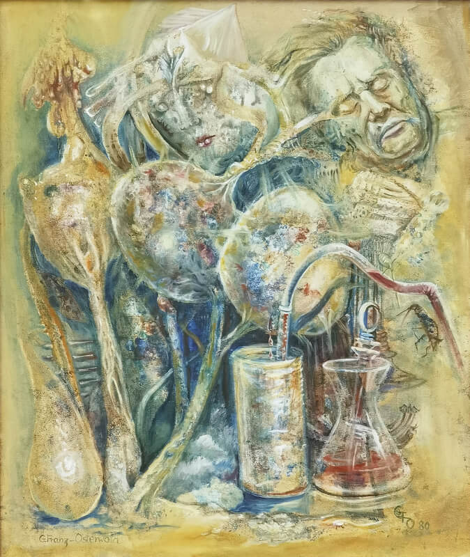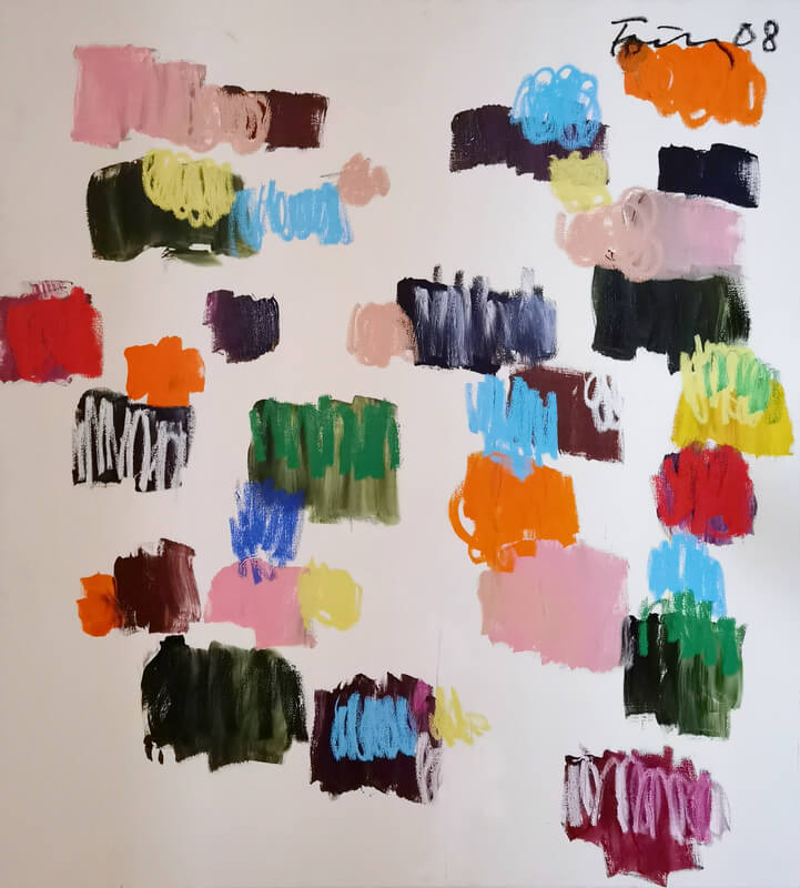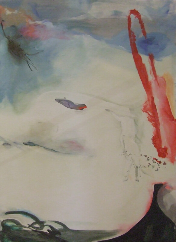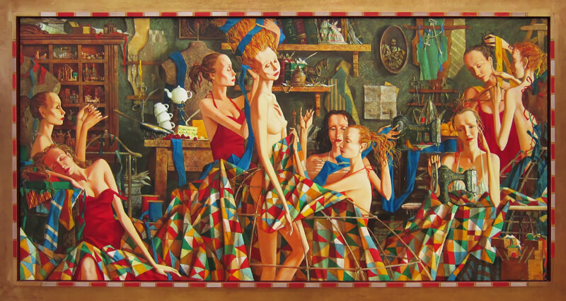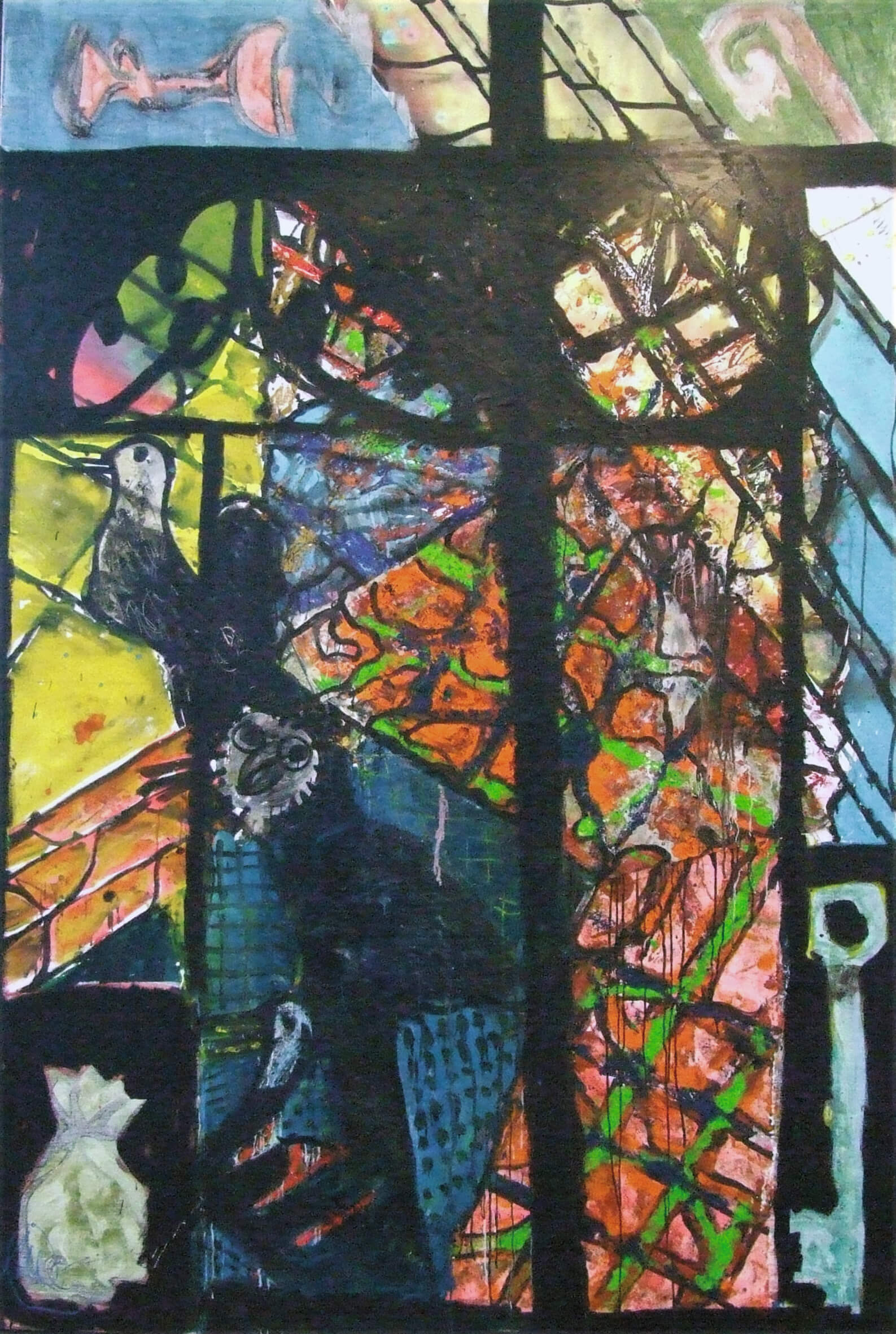 Glasobjekt | Leinwand in Holz mit Schutz aus Plexiglas mit 7 Fischen in glas eingebunden, Leinwand weiß und azur, Glas blau mit Rauch in opal Format: cm