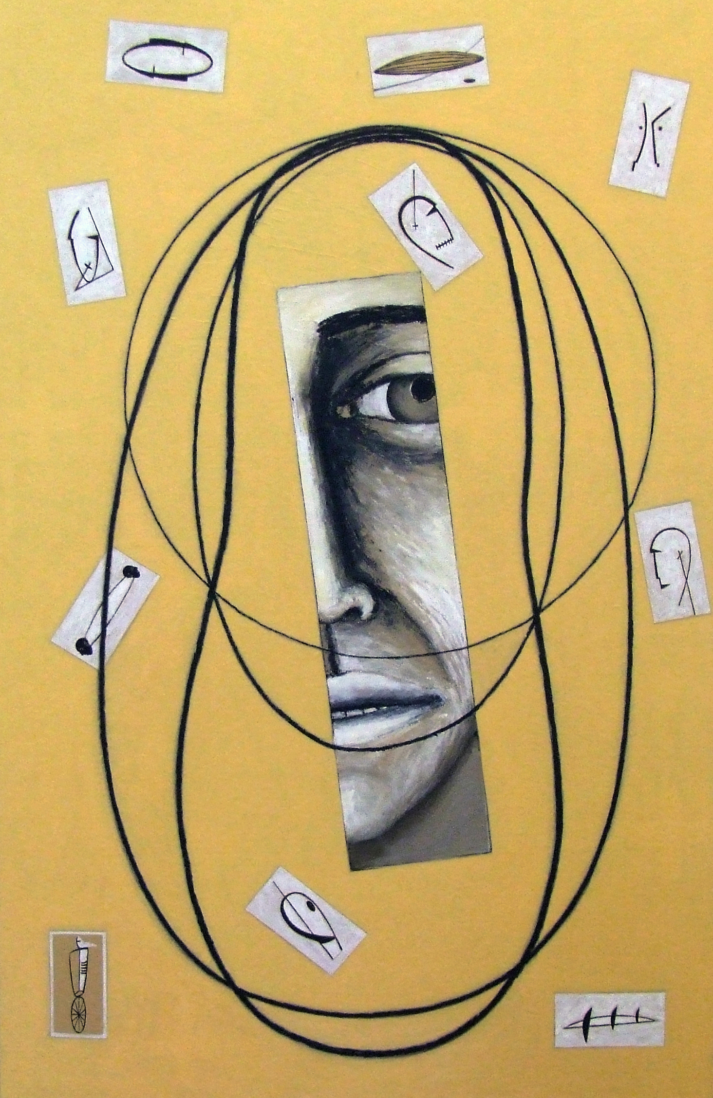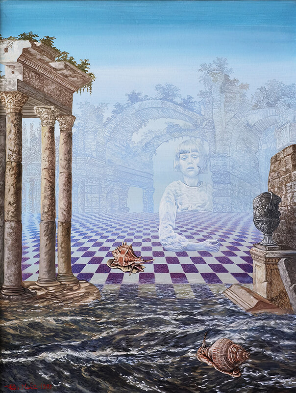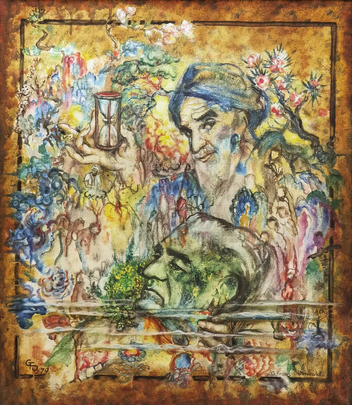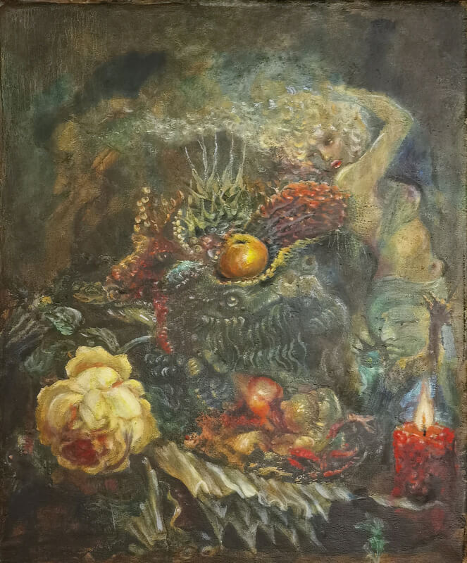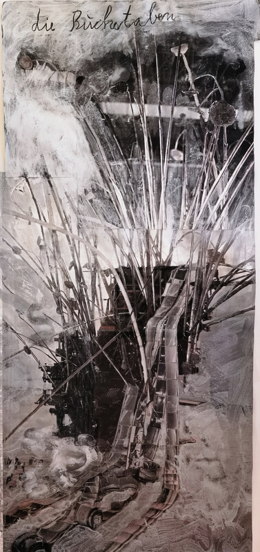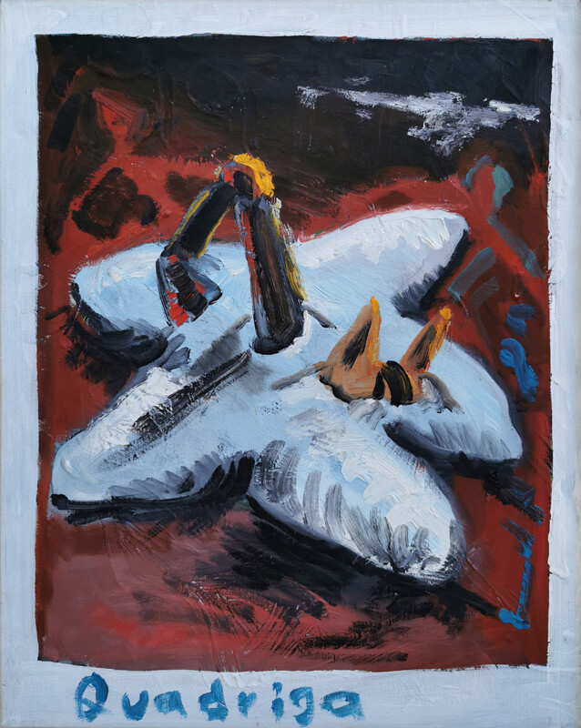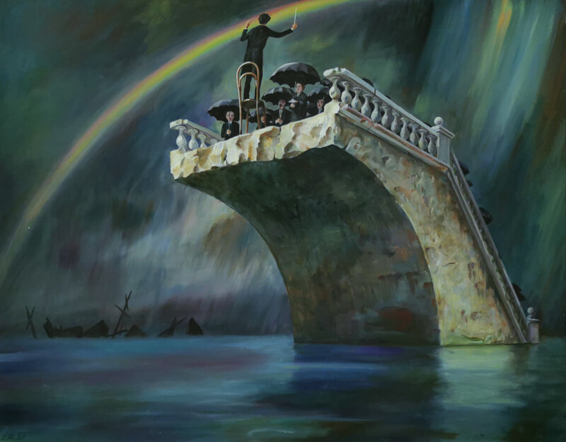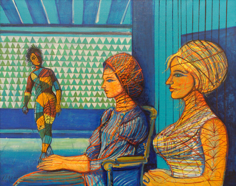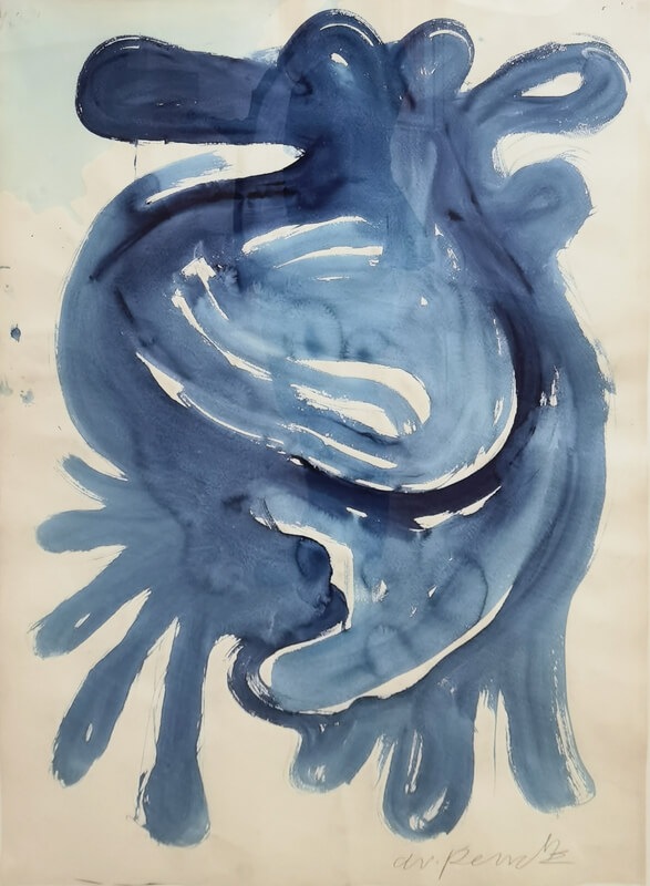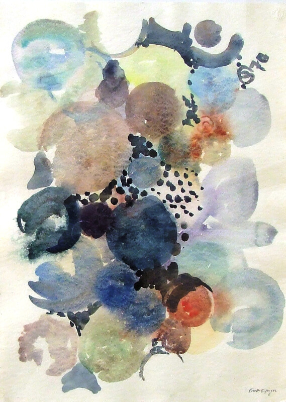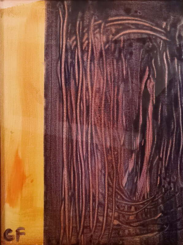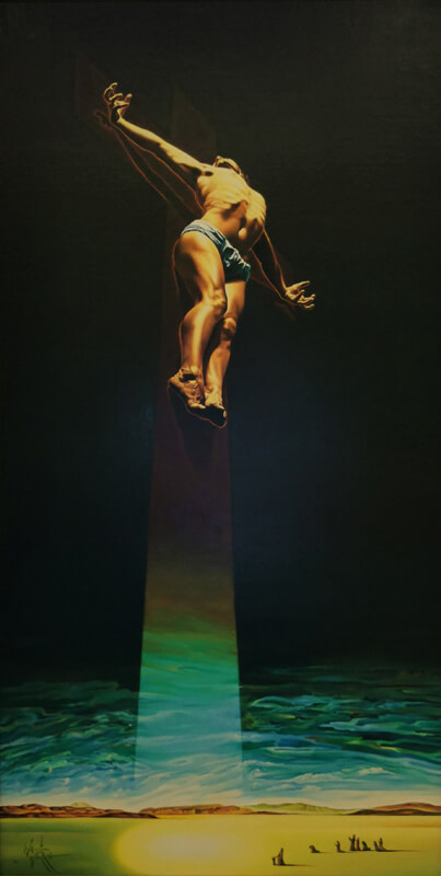 Glasobjekt | Leinwand in Holz mit Schutz aus Plexiglas mit 7 Fischen in glas eingebunden, Leinwand weiß und azur, Glas blau mit Rauch in opal Format: cm