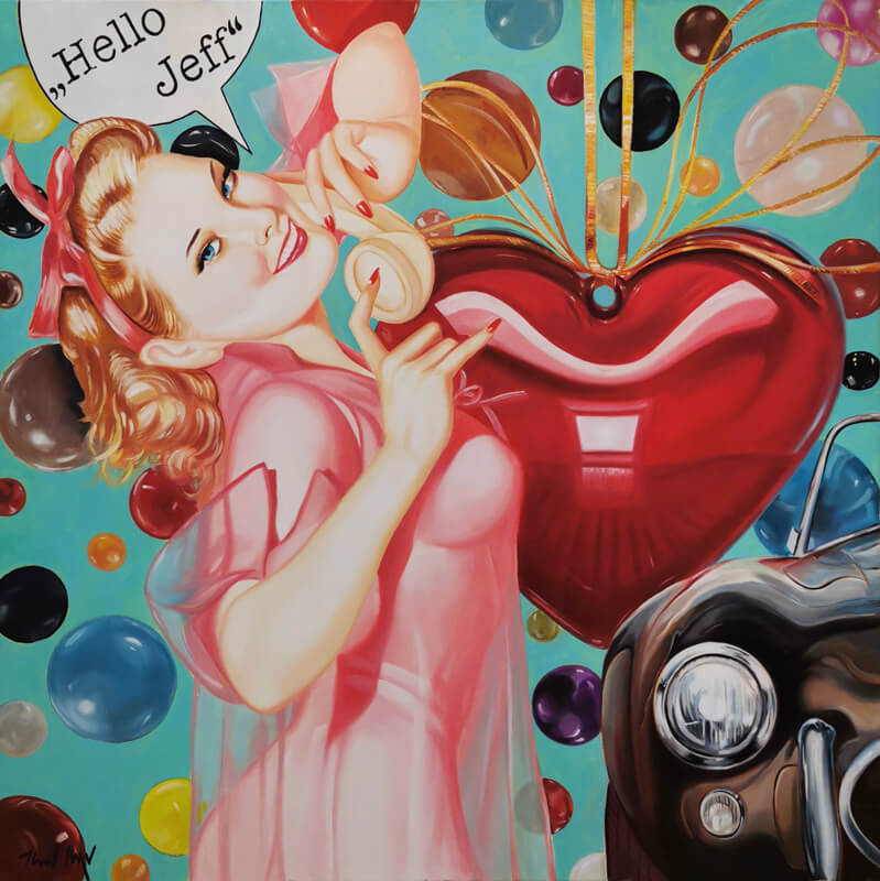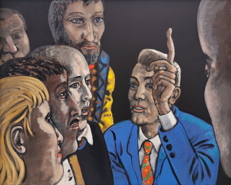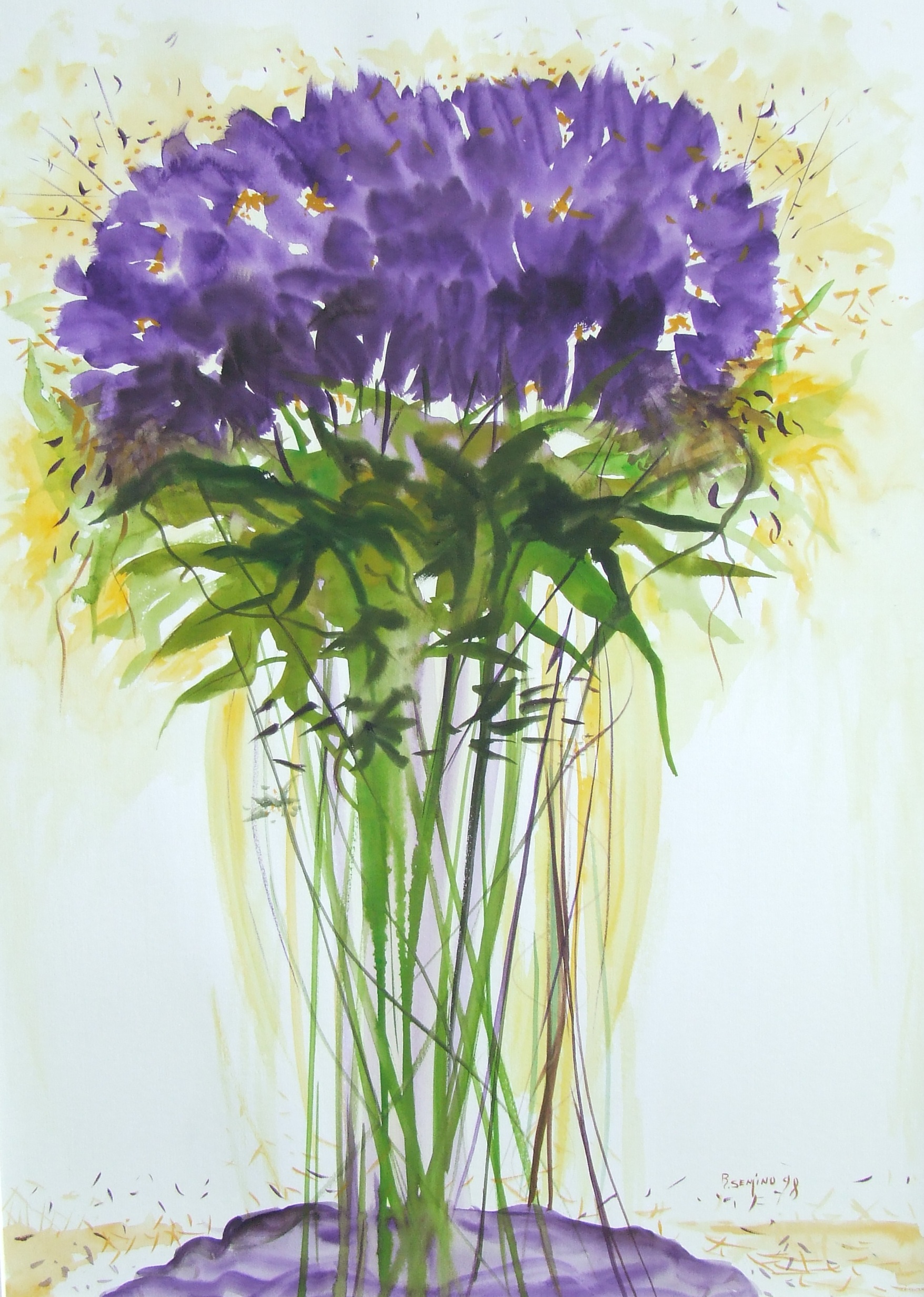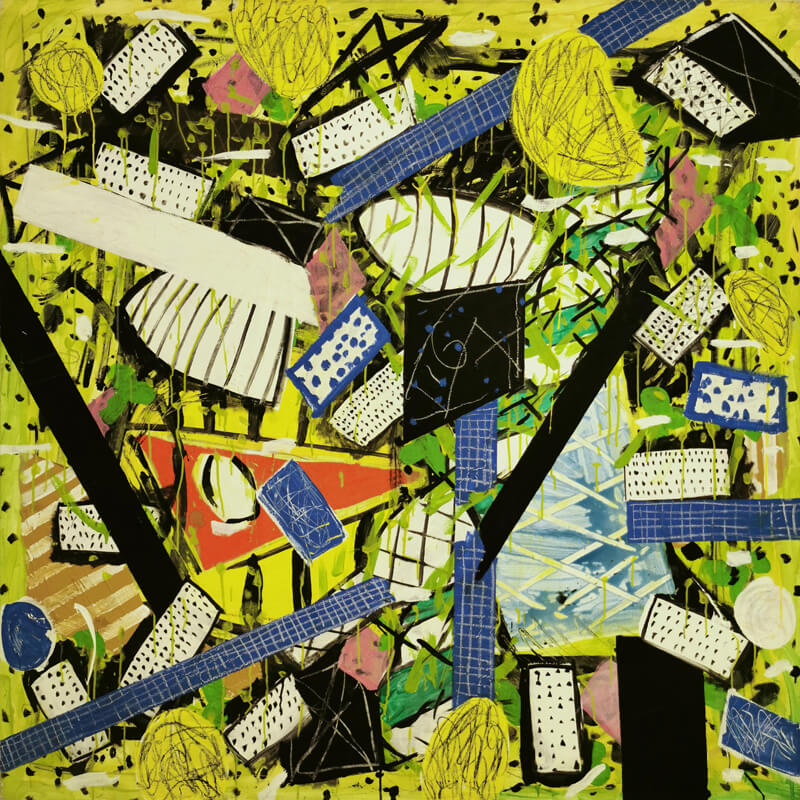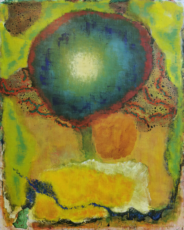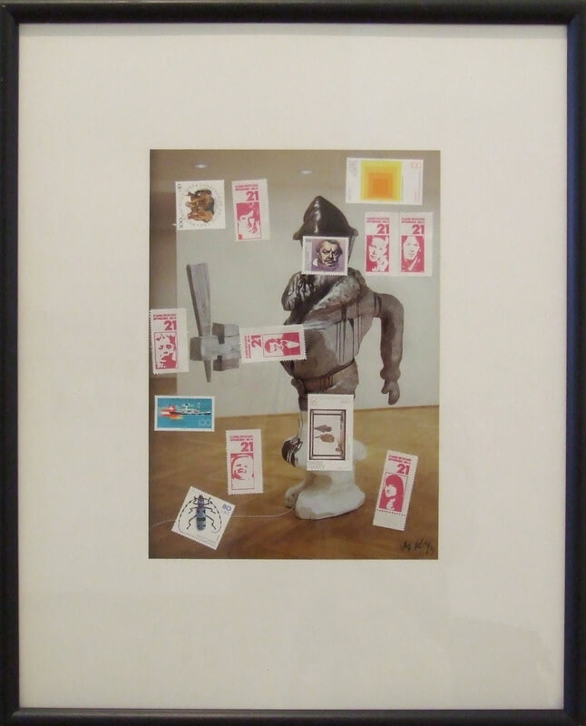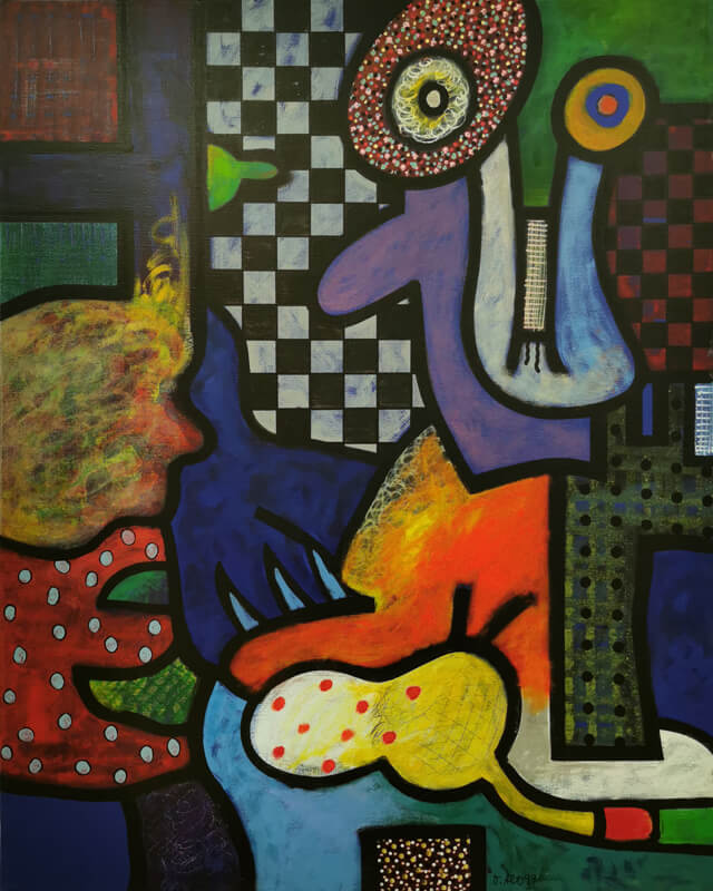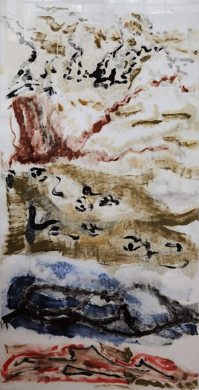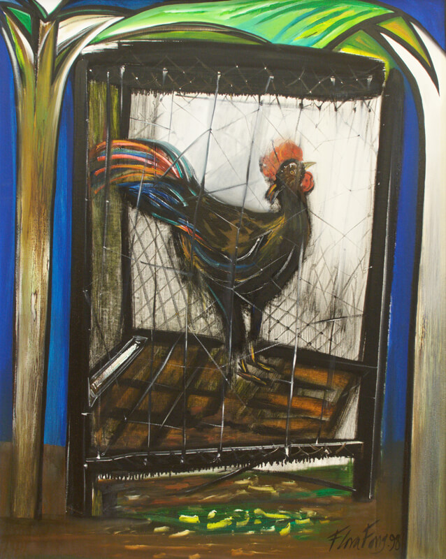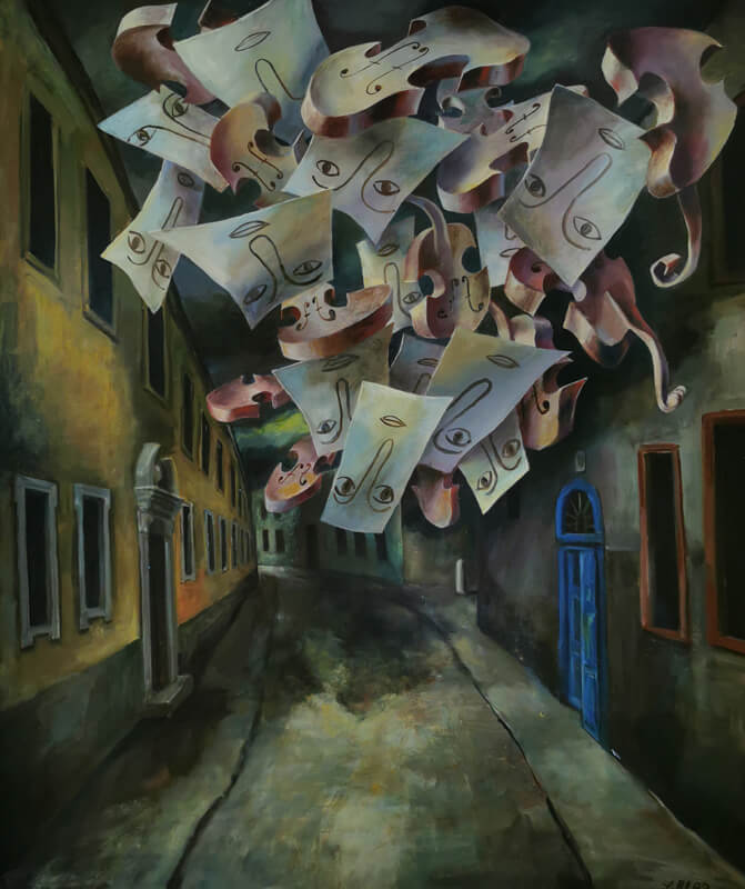 Glasobjekt | Leinwand in Holz mit Schutz aus Plexiglas mit 7 Fischen in glas eingebunden, Leinwand weiß und azur, Glas blau mit Rauch in opal Format: cm
