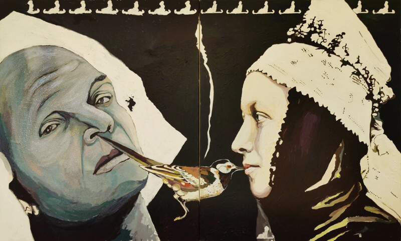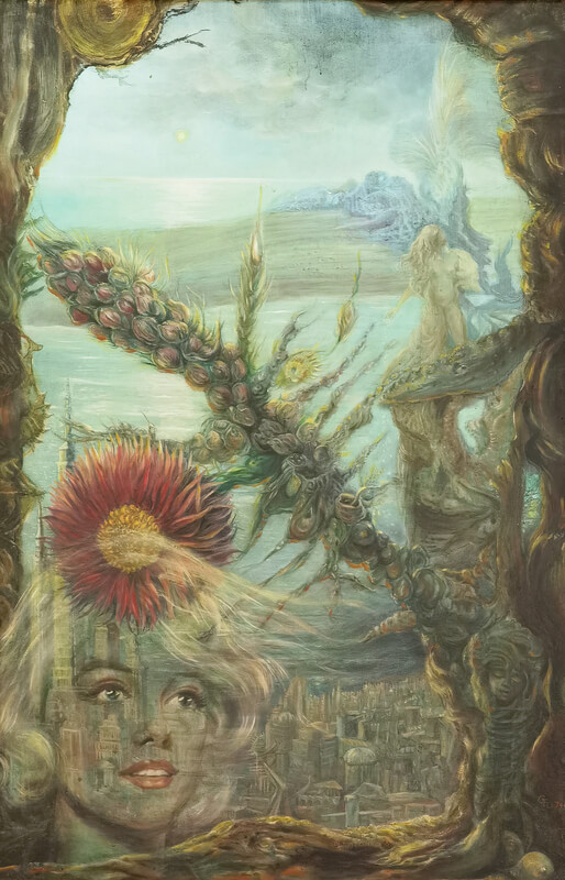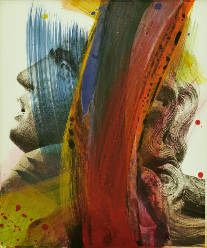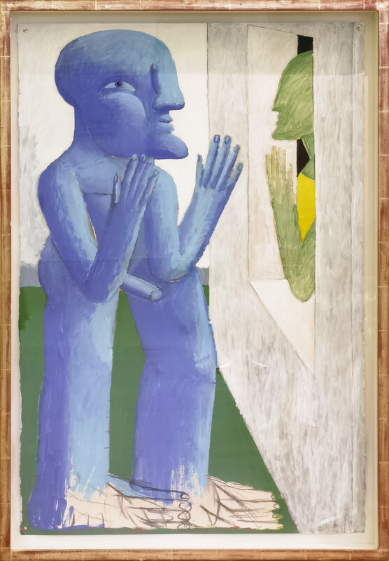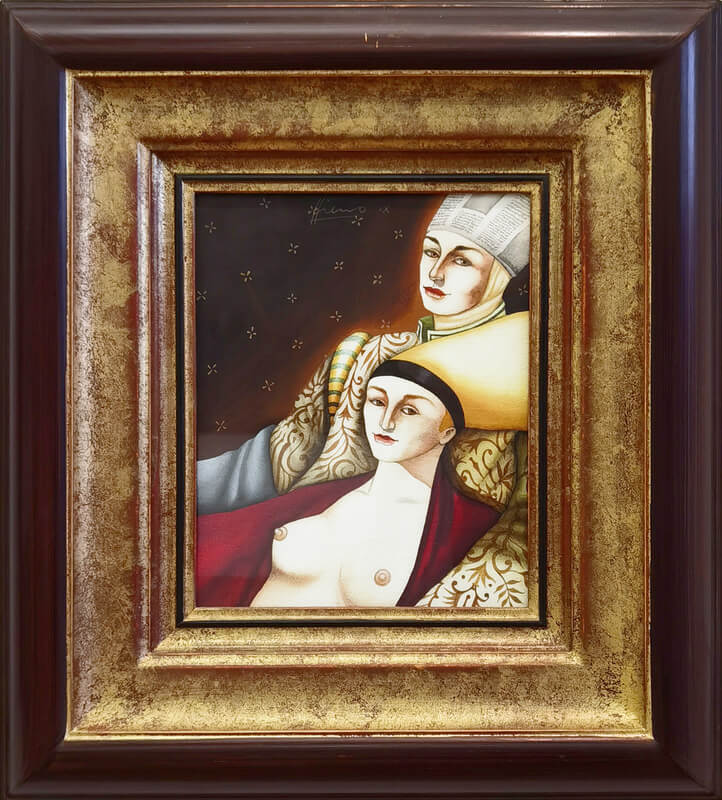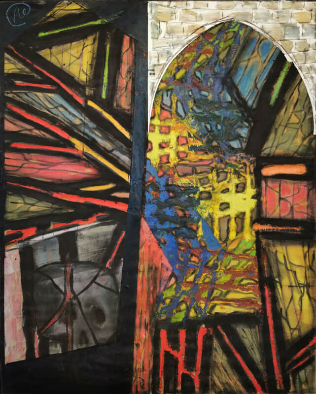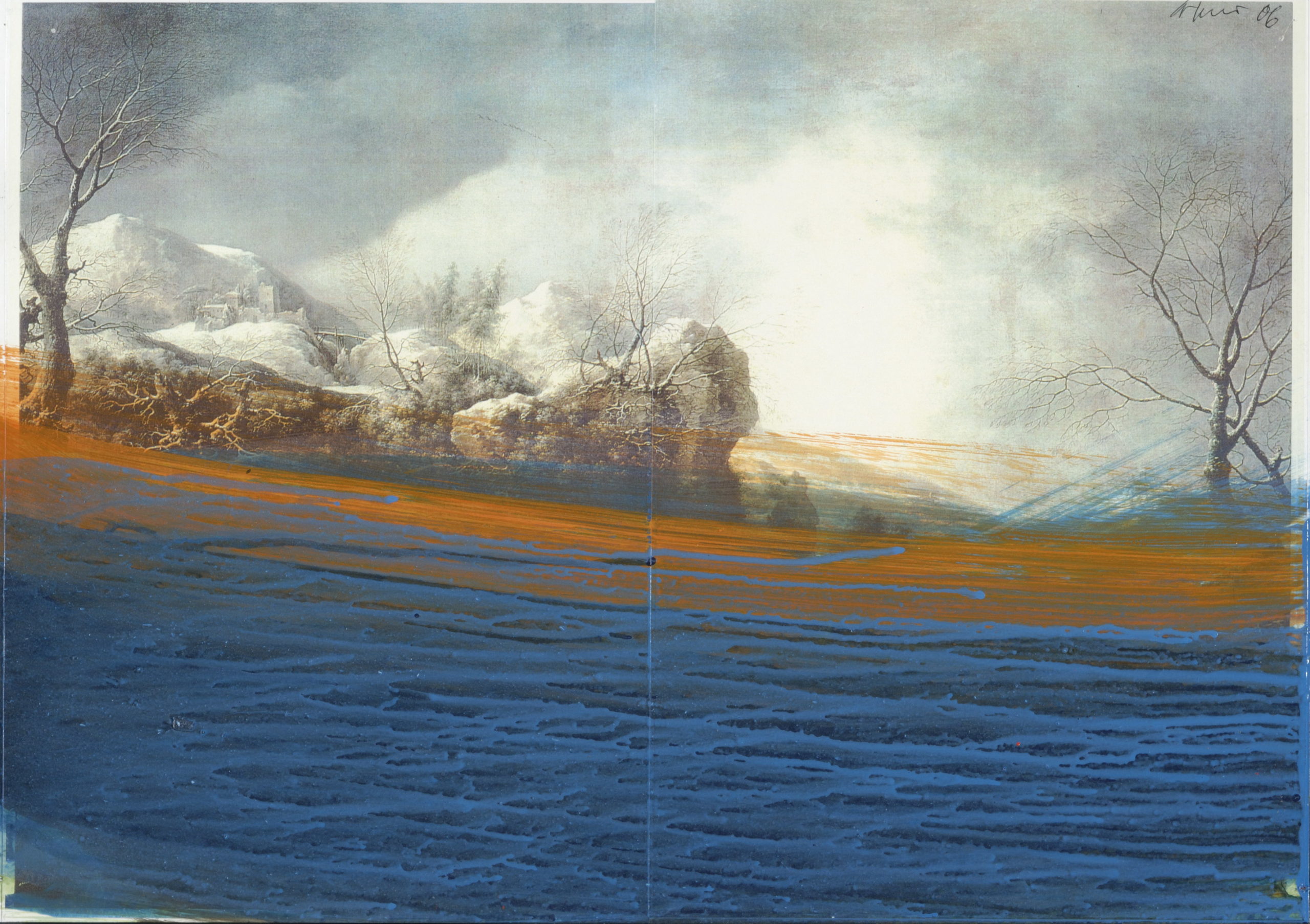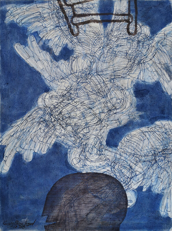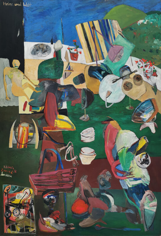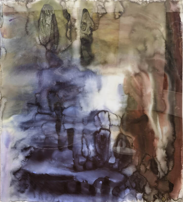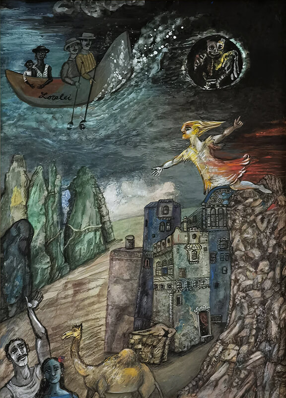 Glasobjekt | Leinwand in Holz mit Schutz aus Plexiglas mit 7 Fischen in glas eingebunden, Leinwand weiß und azur, Glas blau mit Rauch in opal Format: cm