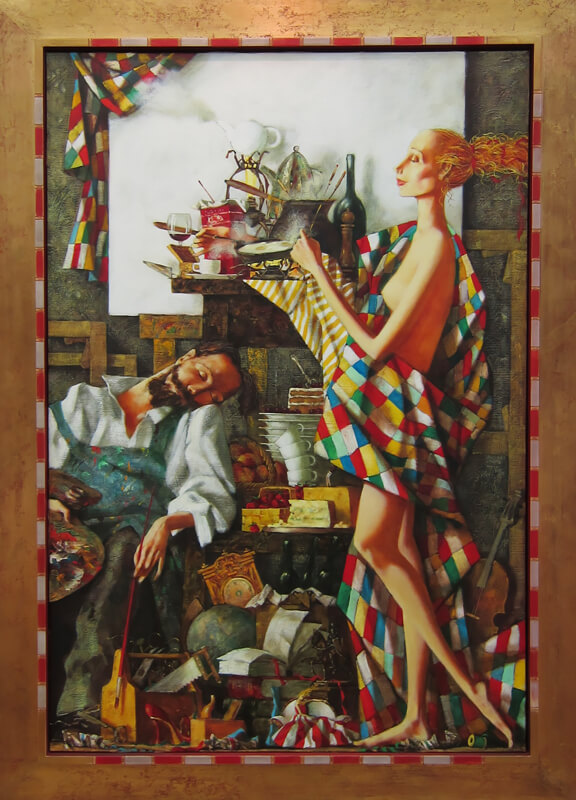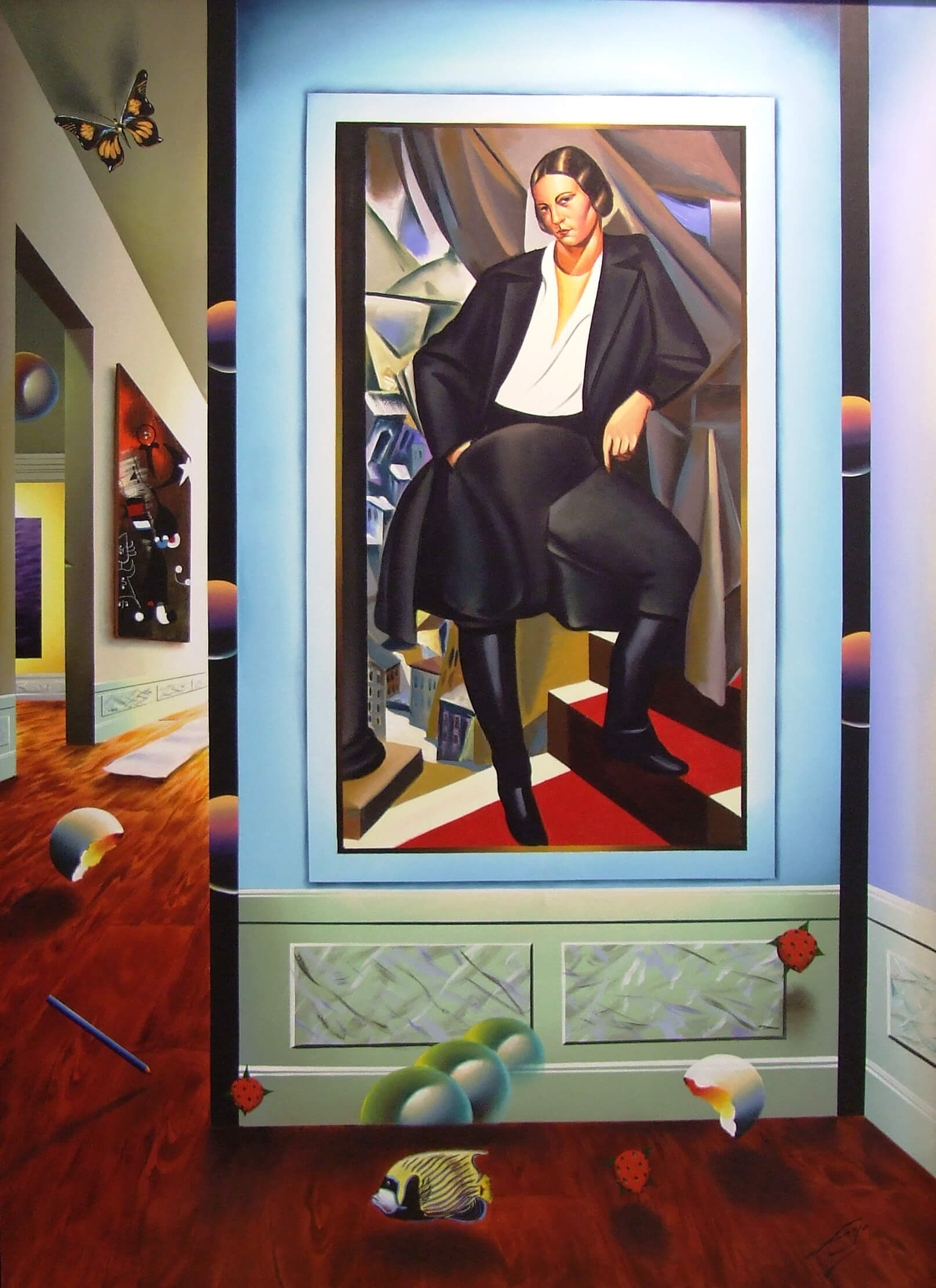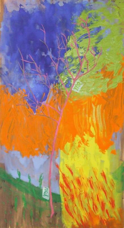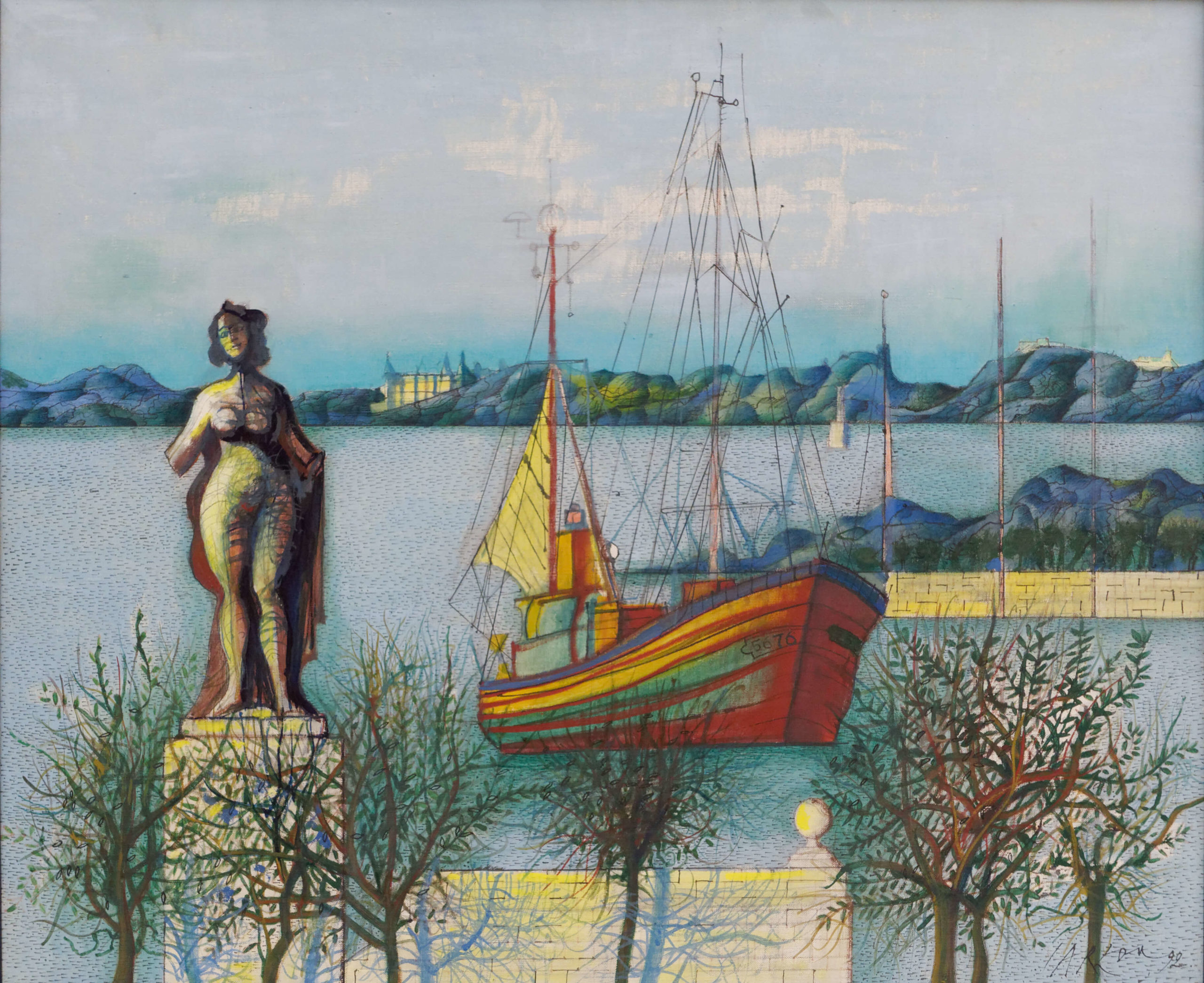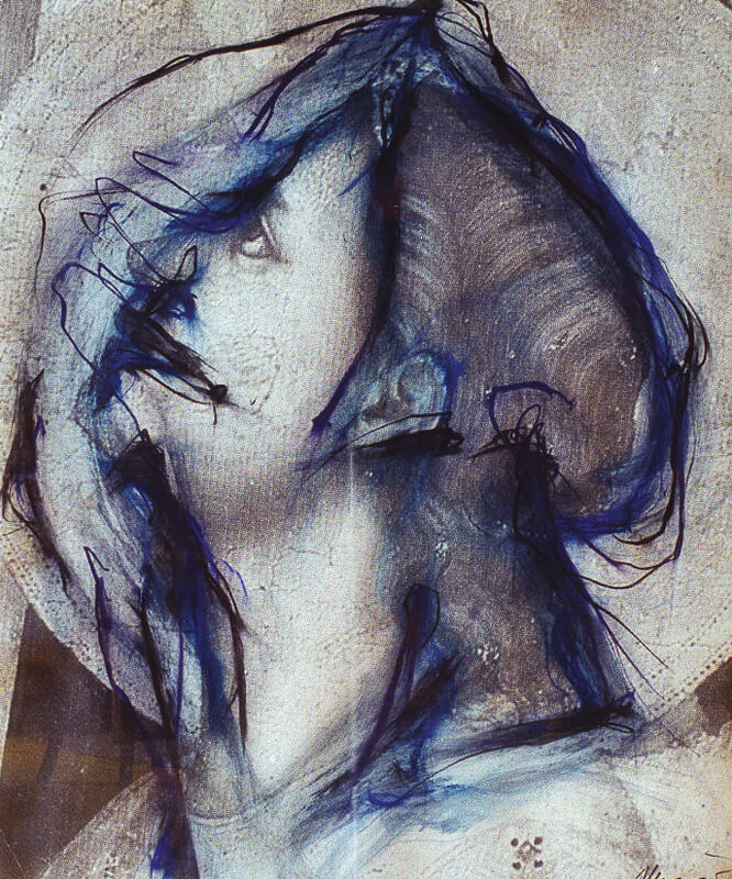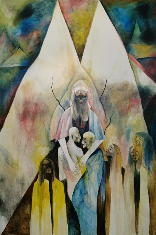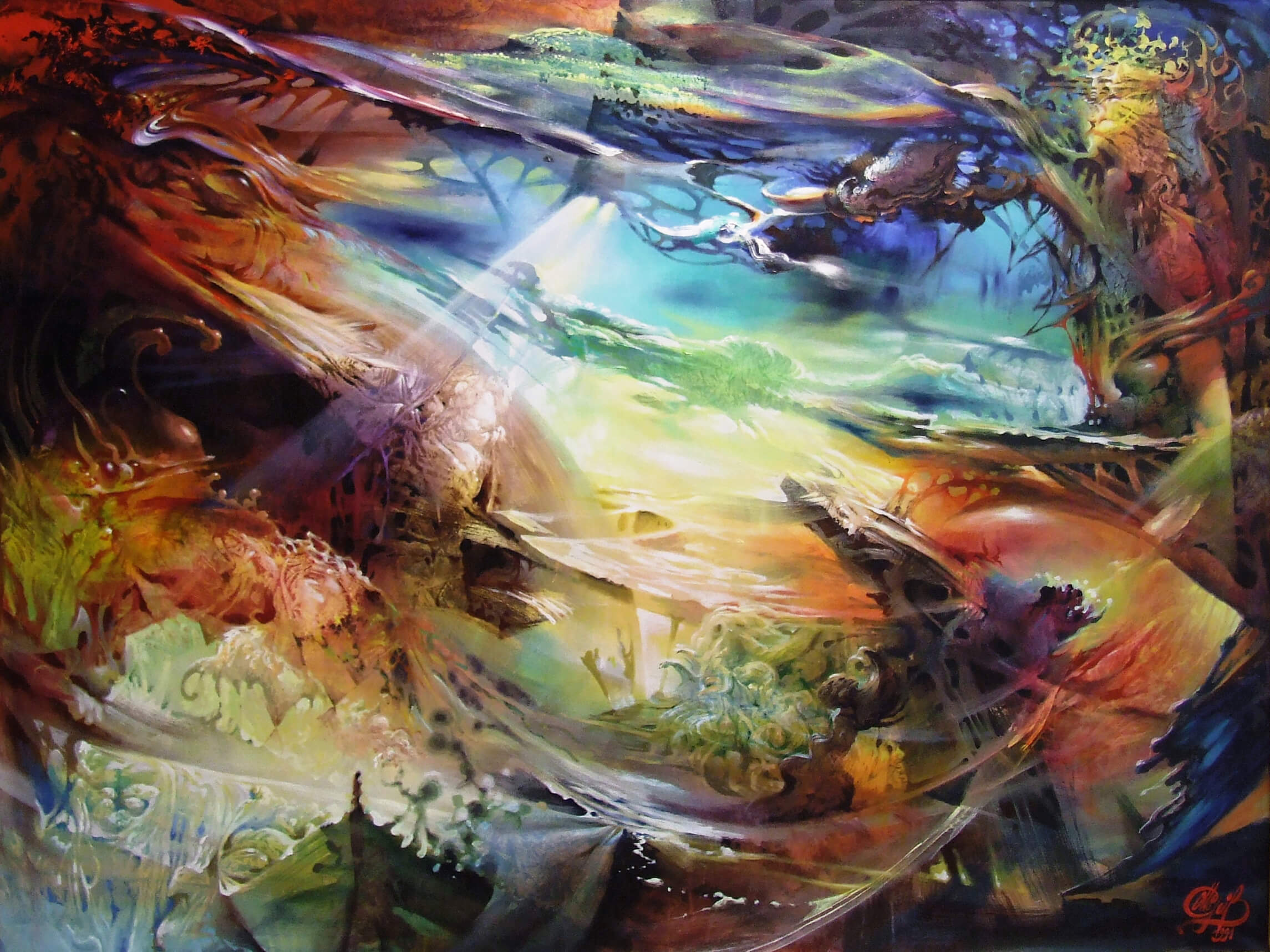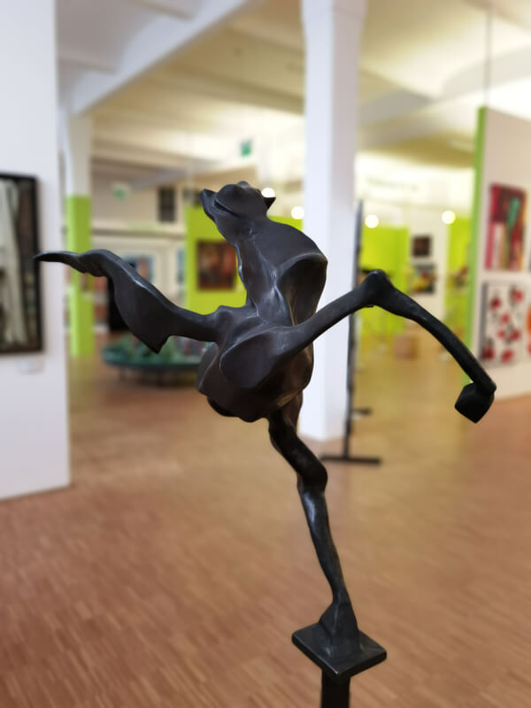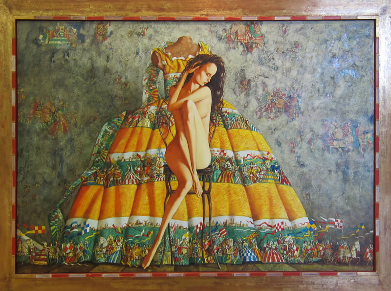 Glasobjekt | Leinwand in Holz mit Schutz aus Plexiglas mit 7 Fischen in glas eingebunden, Leinwand weiß und azur, Glas blau mit Rauch in opal Format: cm