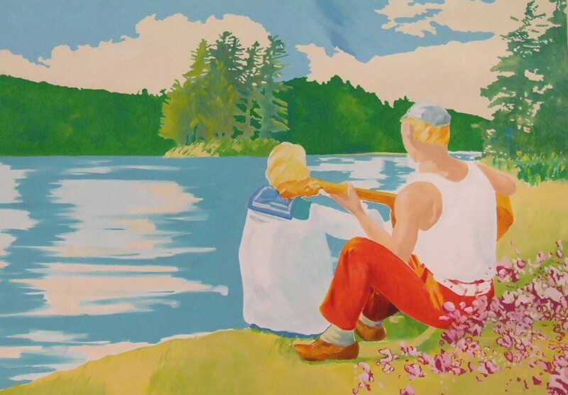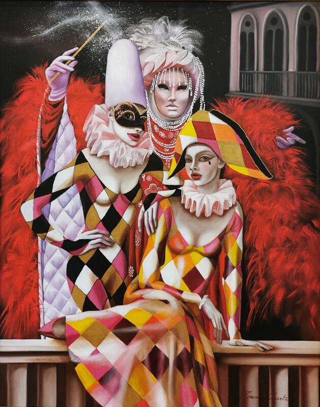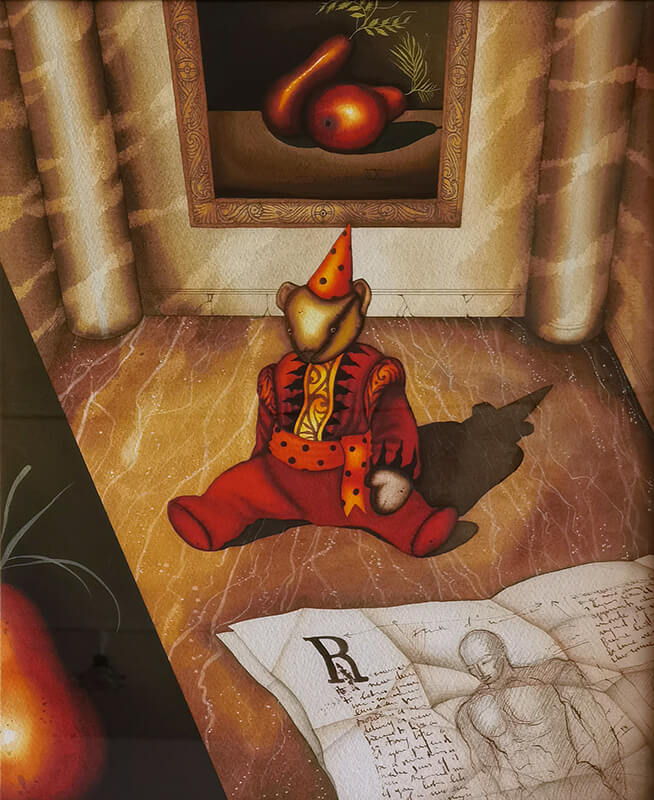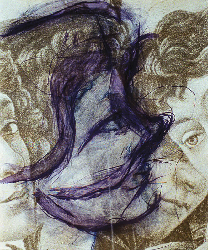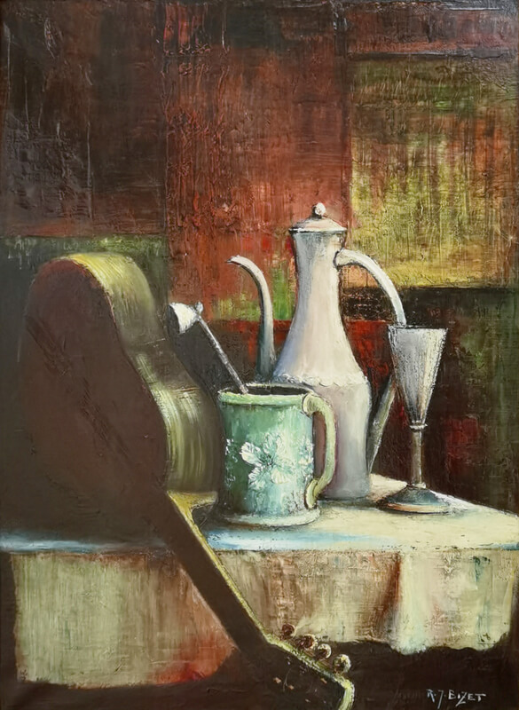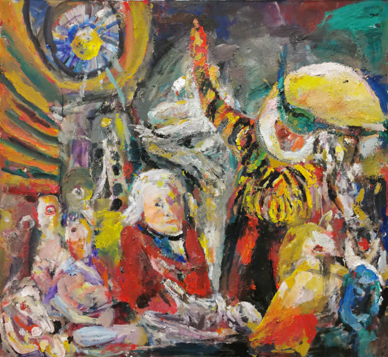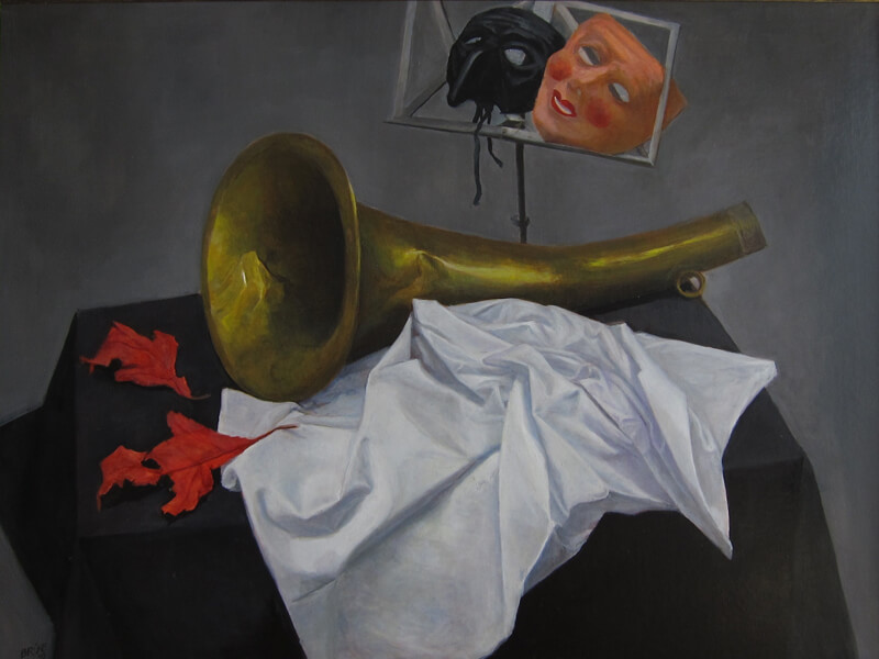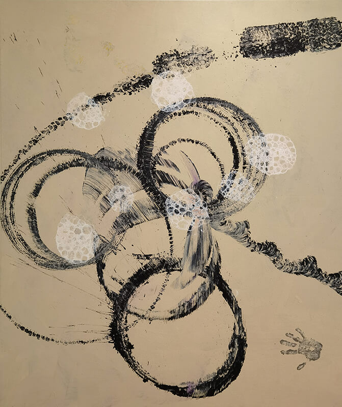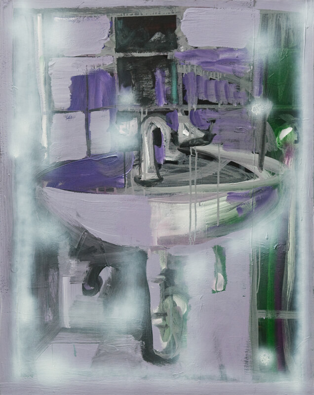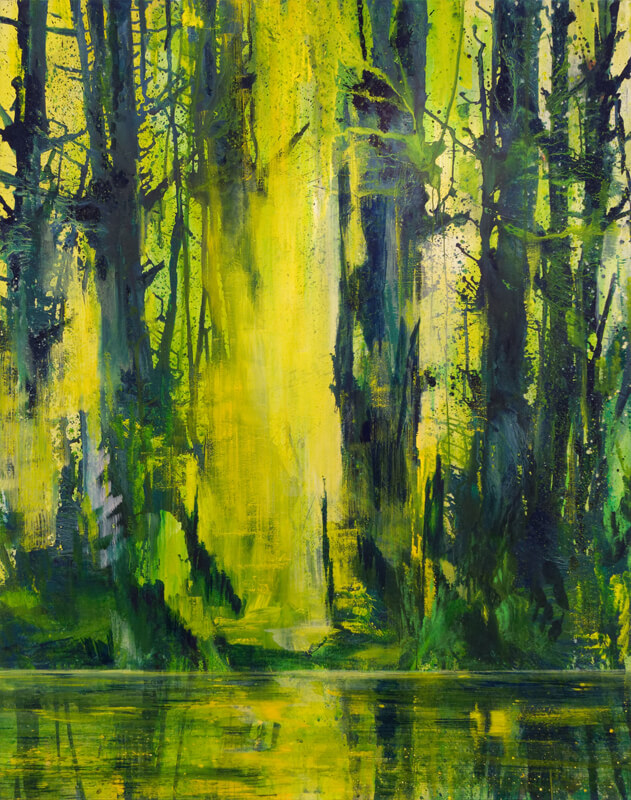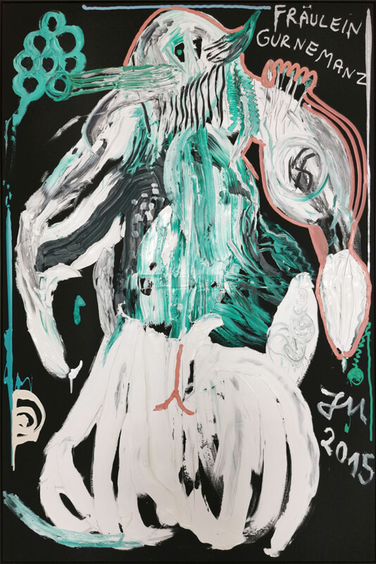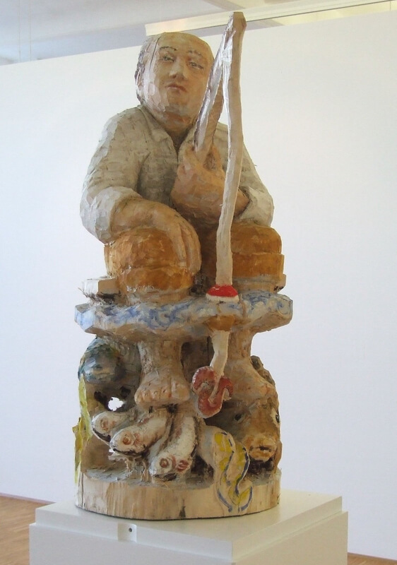 Glasobjekt | Leinwand in Holz mit Schutz aus Plexiglas mit 7 Fischen in glas eingebunden, Leinwand weiß und azur, Glas blau mit Rauch in opal Format: cm
