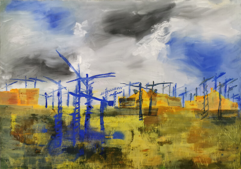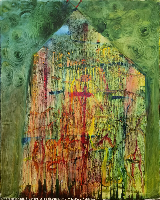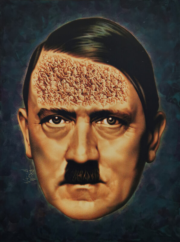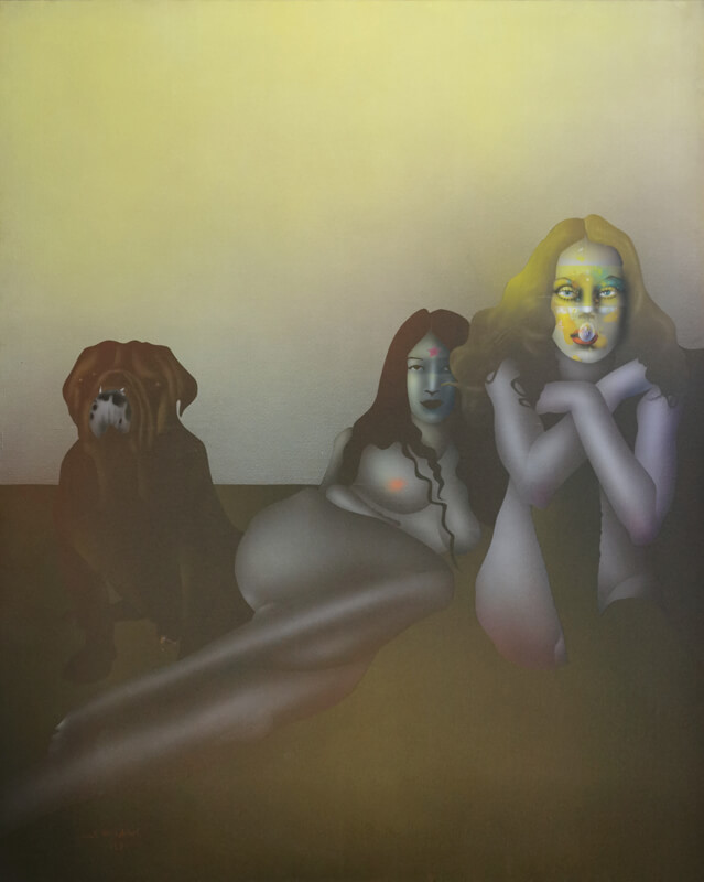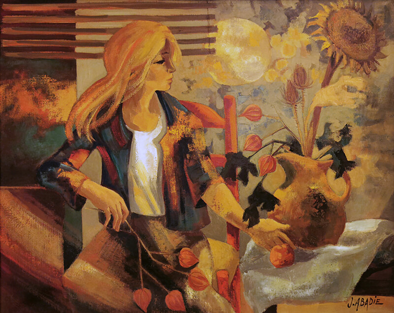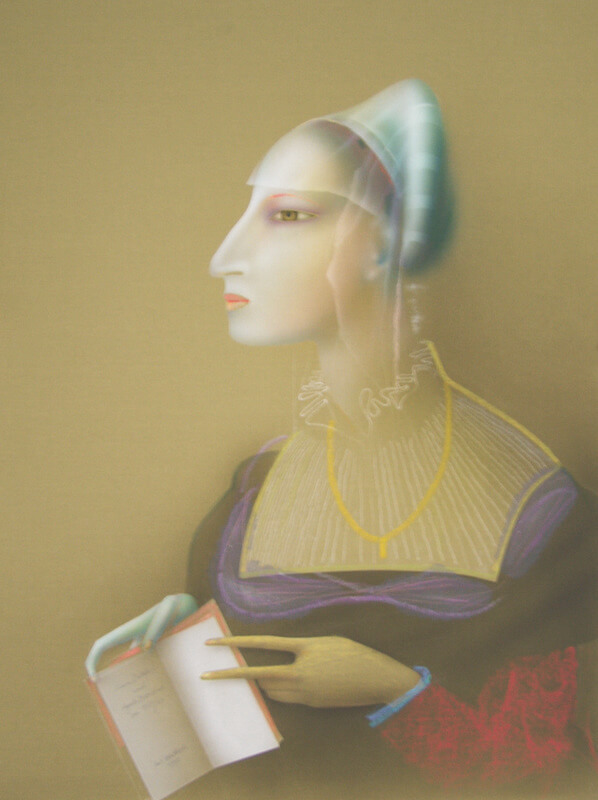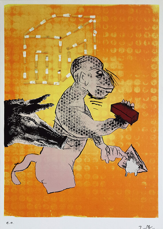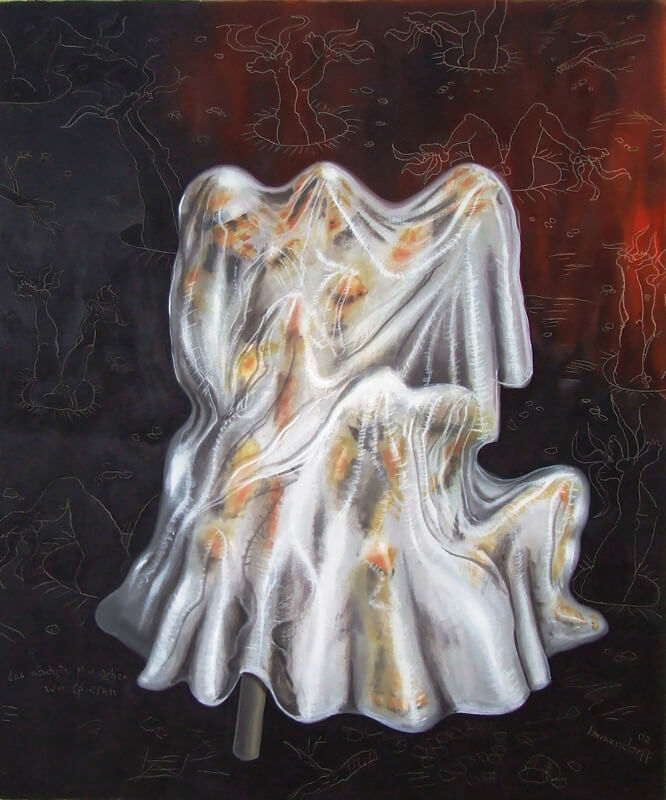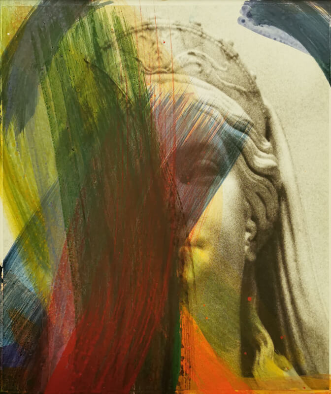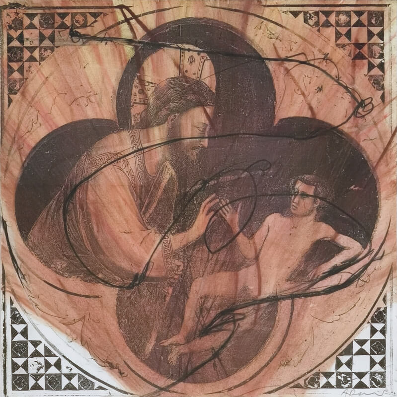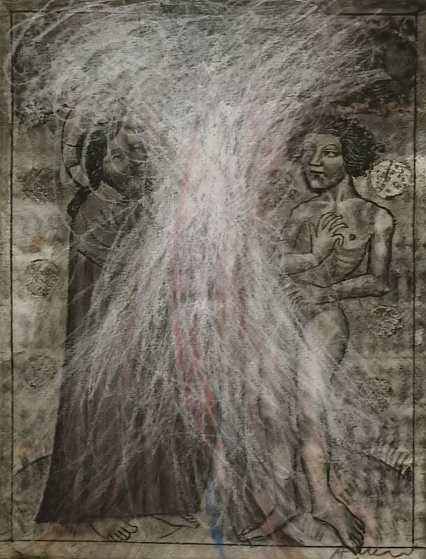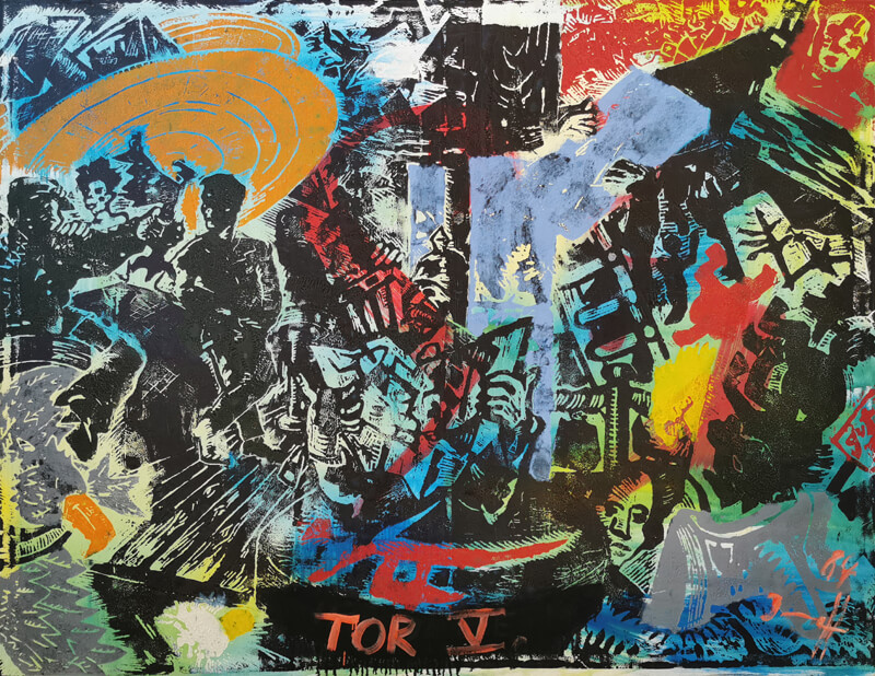Glasobjekt | Leinwand in Holz mit Schutz aus Plexiglas mit 7 Fischen in glas eingebunden, Leinwand weiß und azur, Glas blau mit Rauch in opal Format: cm