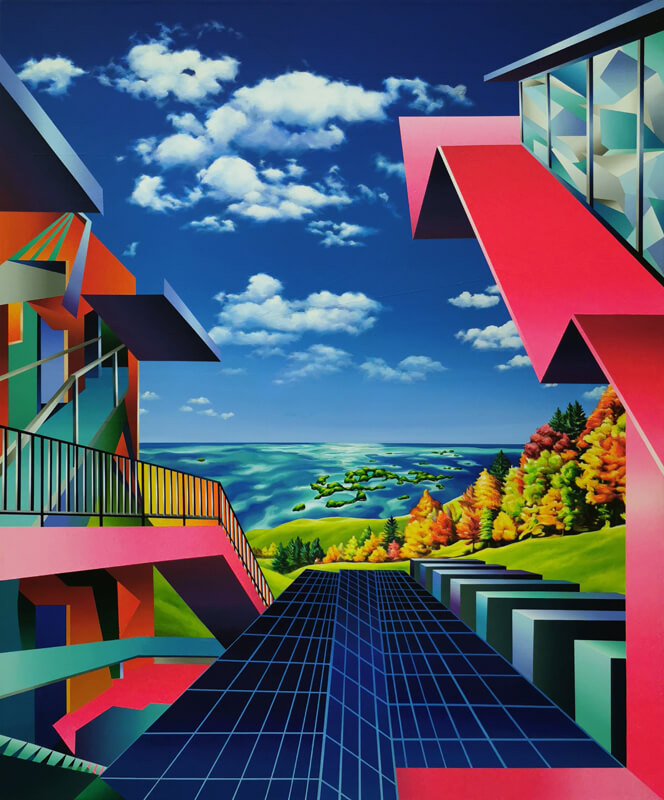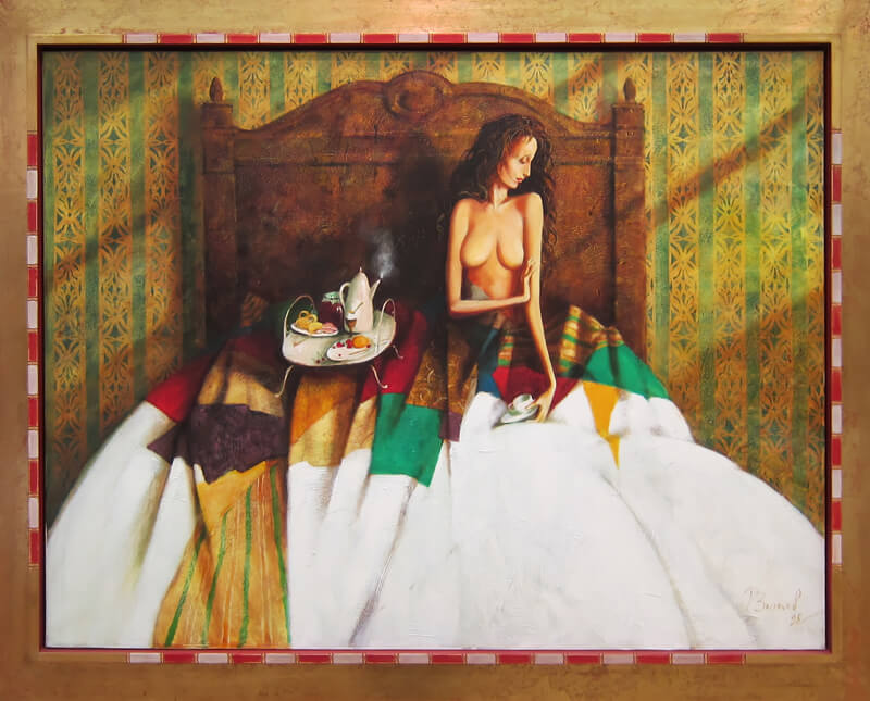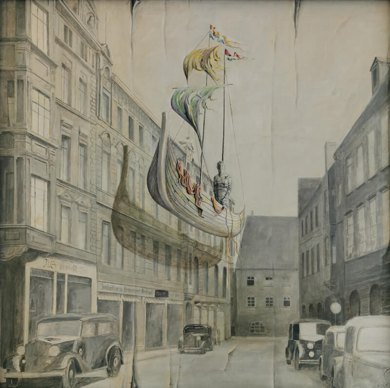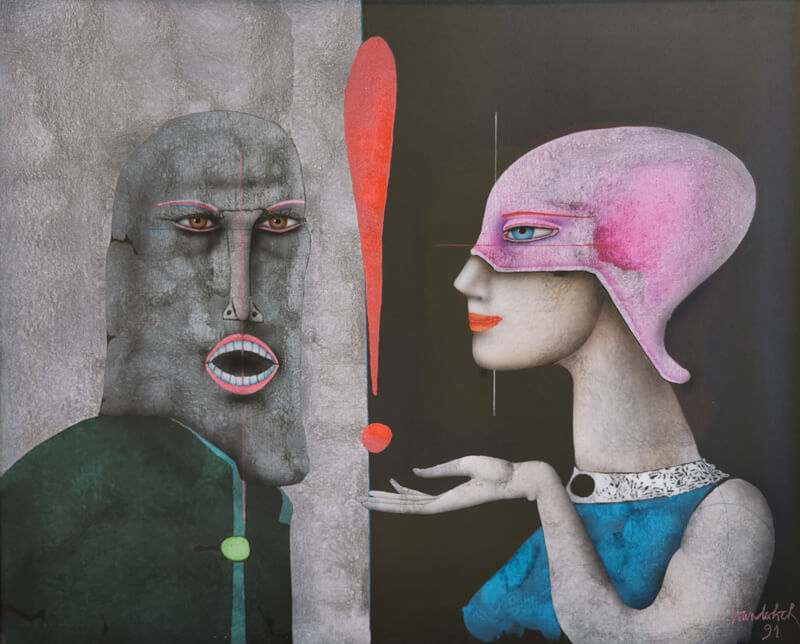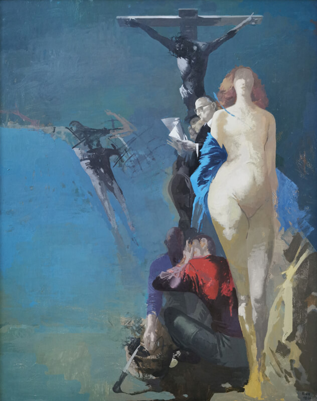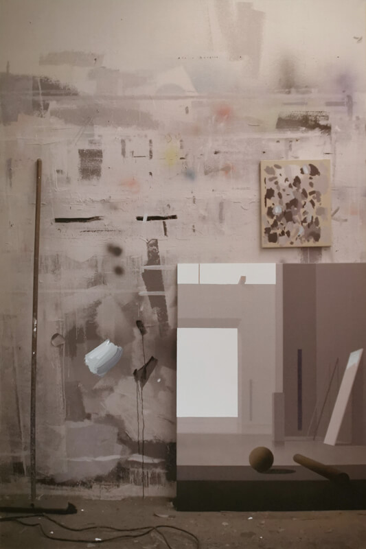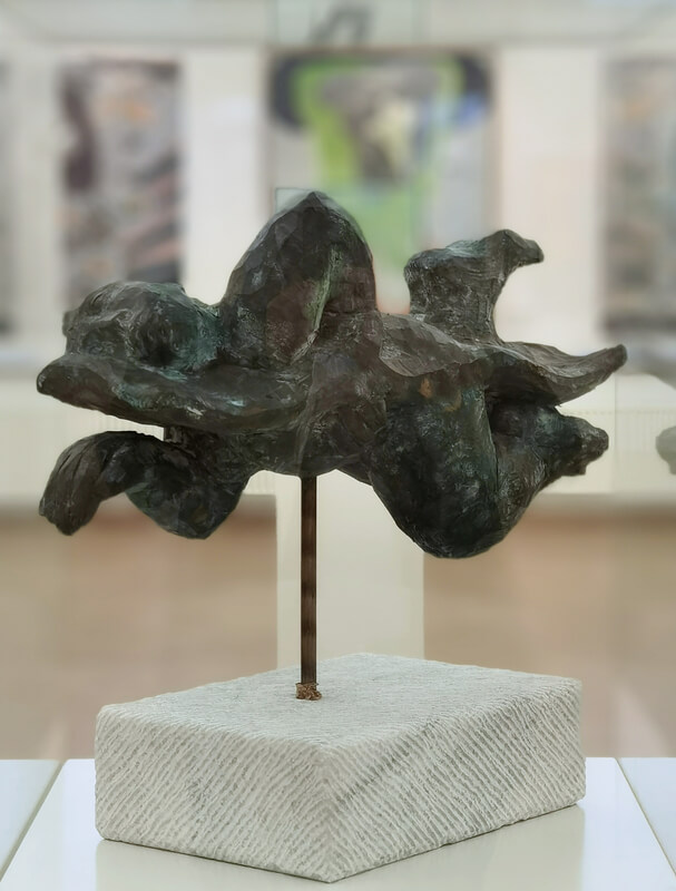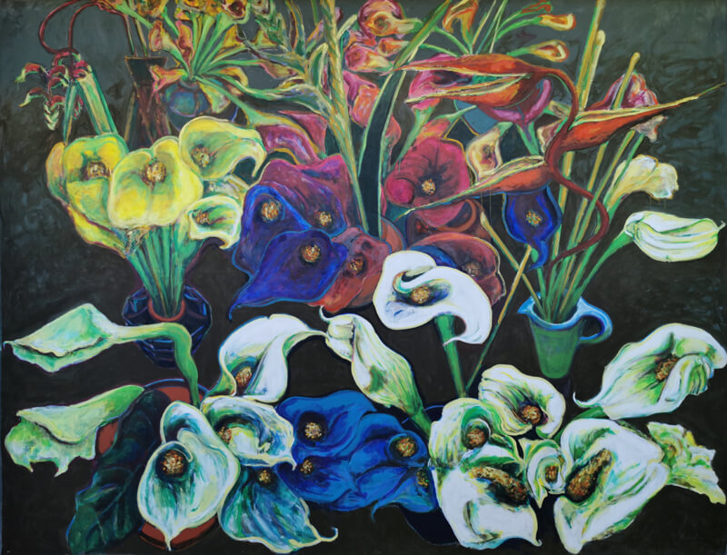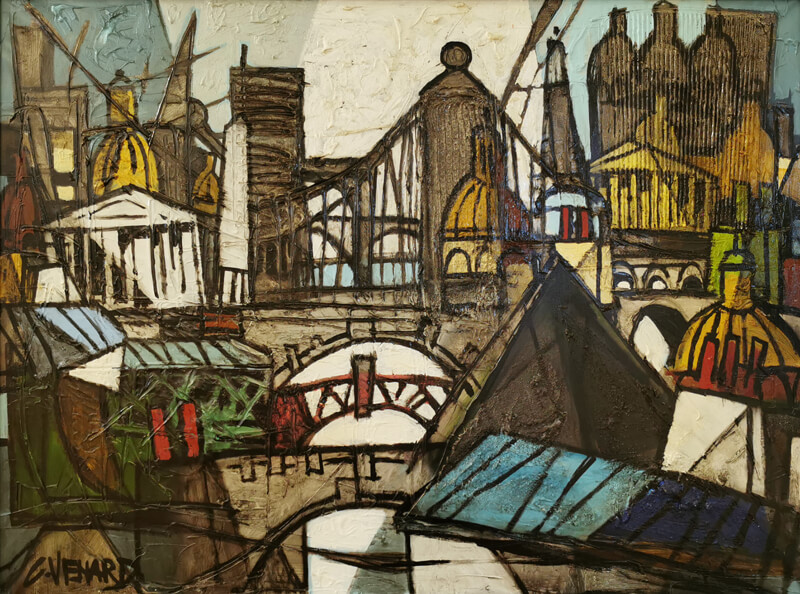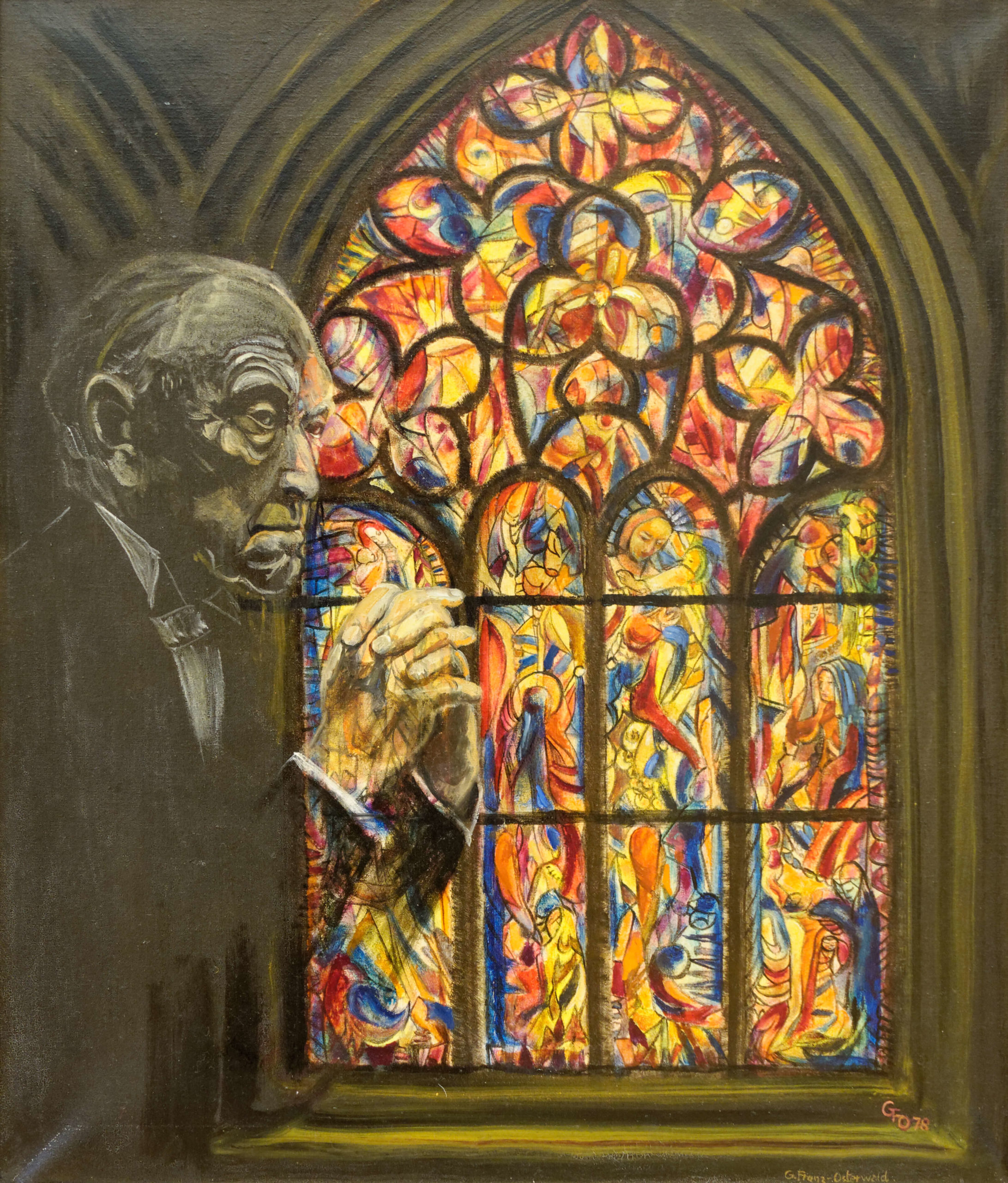 Glasobjekt | Leinwand in Holz mit Schutz aus Plexiglas mit 7 Fischen in glas eingebunden, Leinwand weiß und azur, Glas blau mit Rauch in opal Format: cm