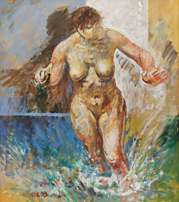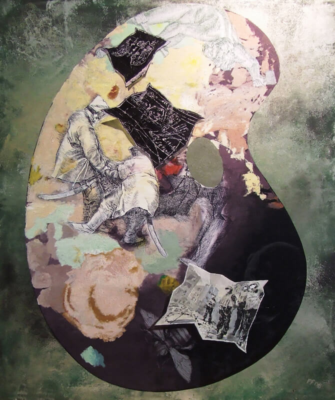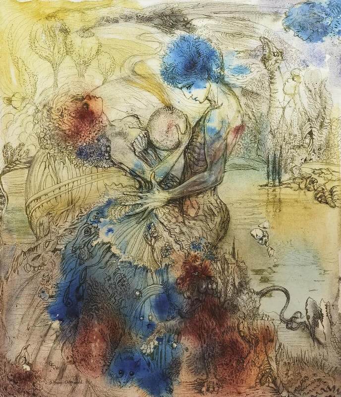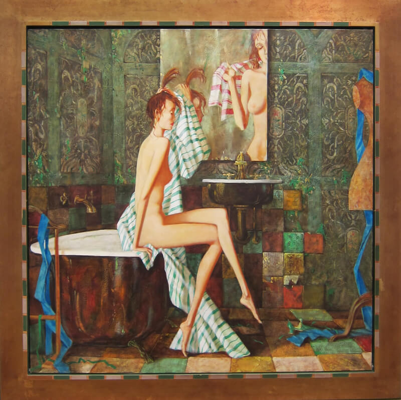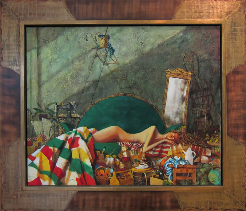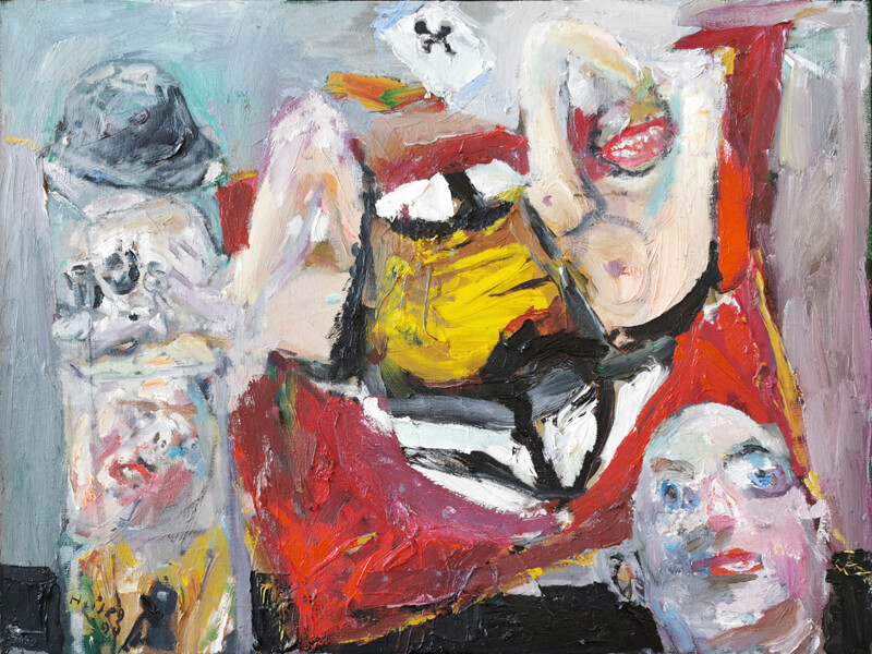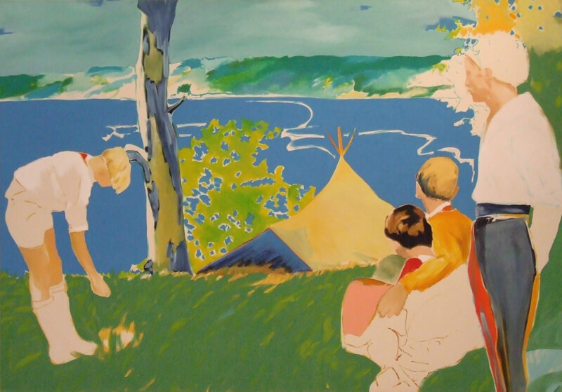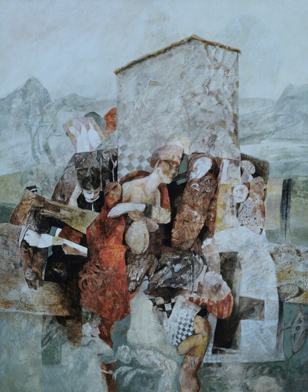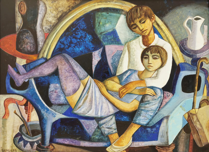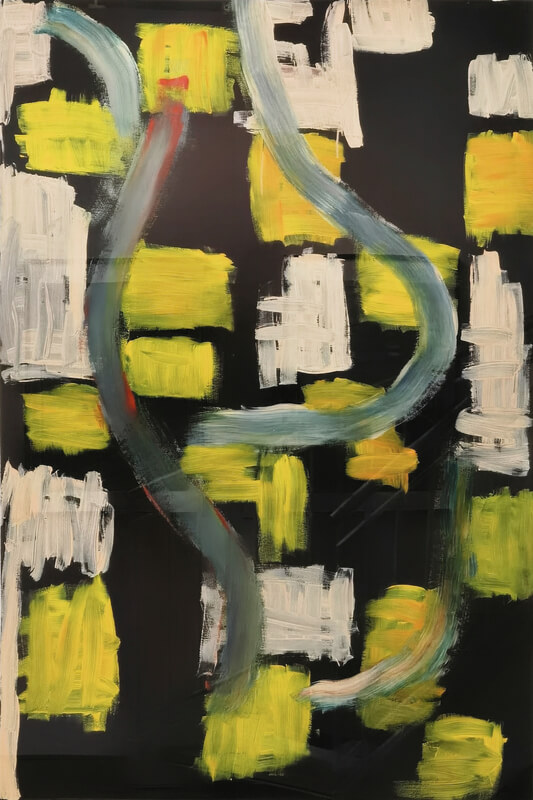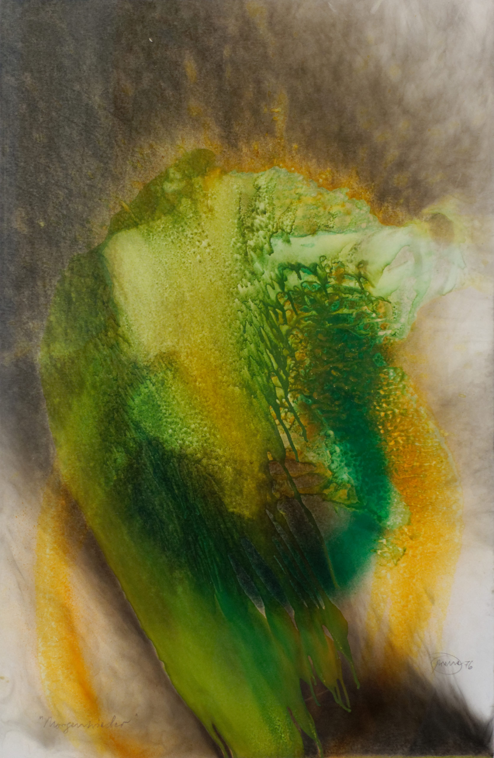 Glasobjekt | Leinwand in Holz mit Schutz aus Plexiglas mit 7 Fischen in glas eingebunden, Leinwand weiß und azur, Glas blau mit Rauch in opal Format: cm