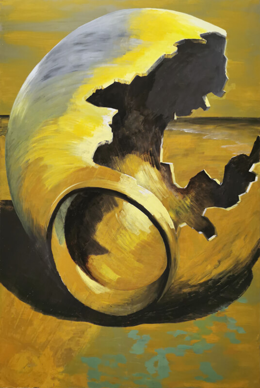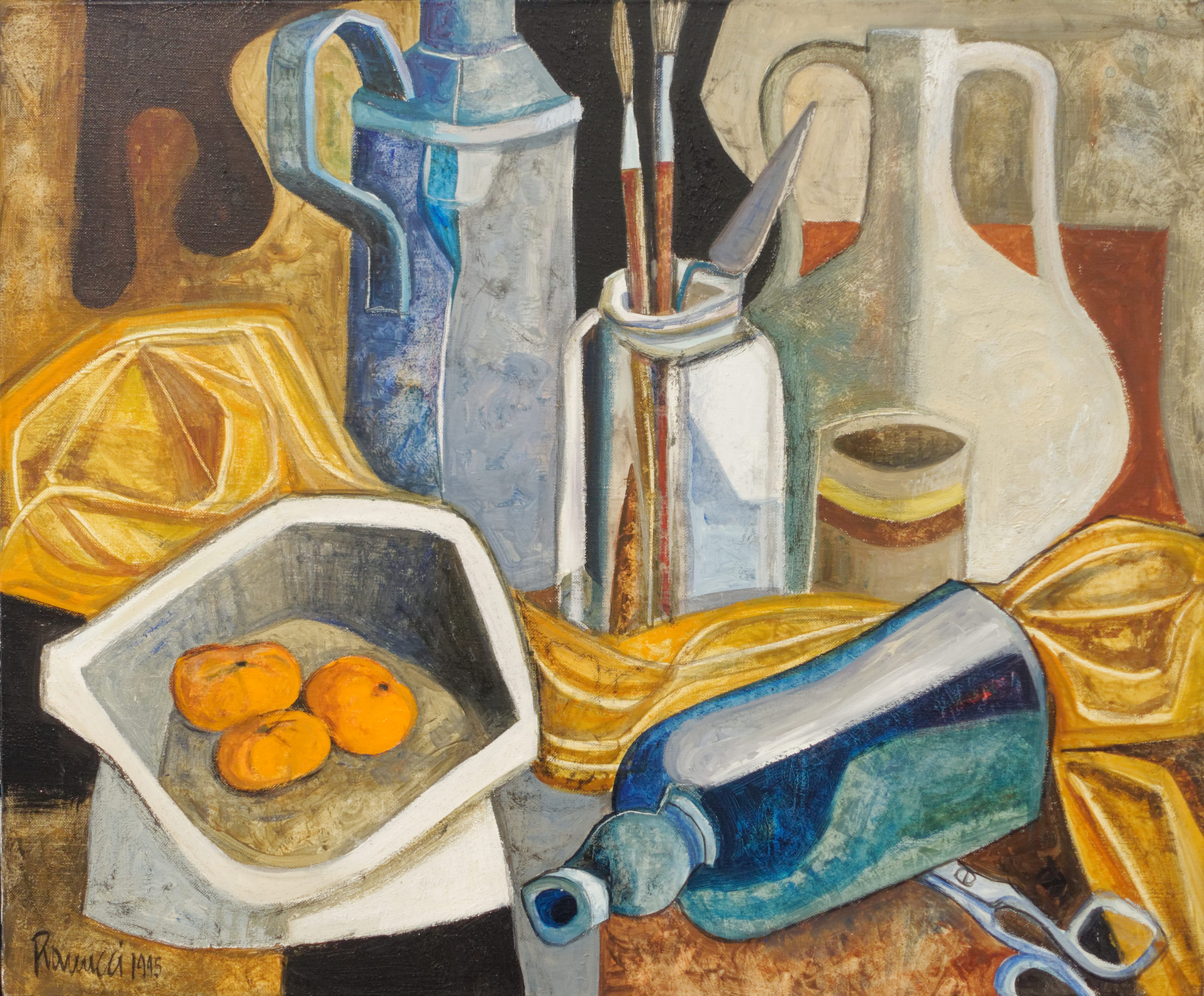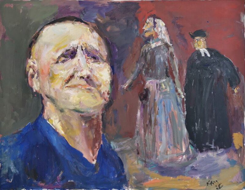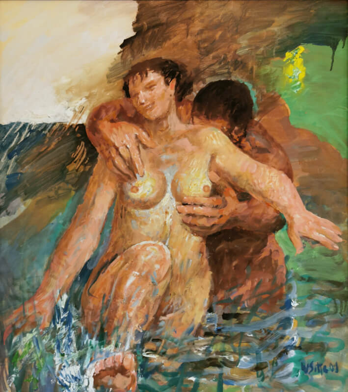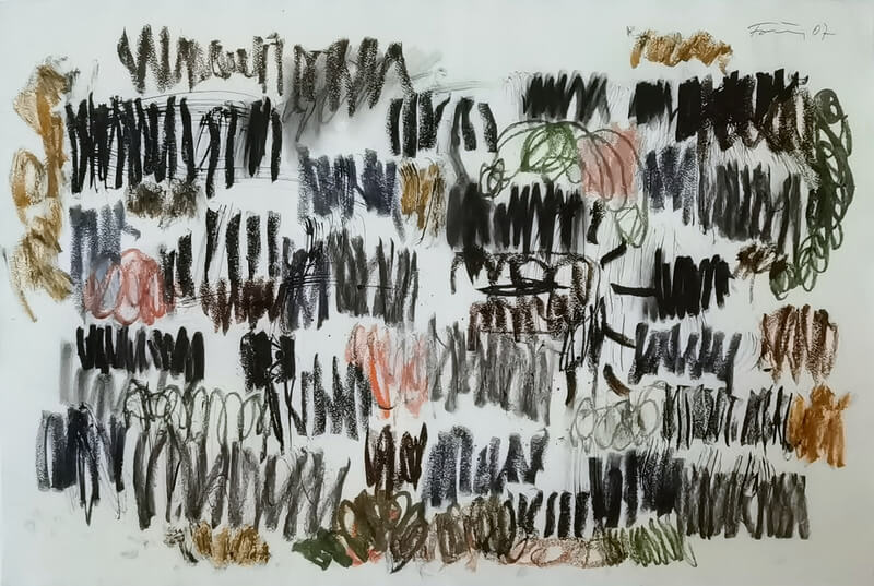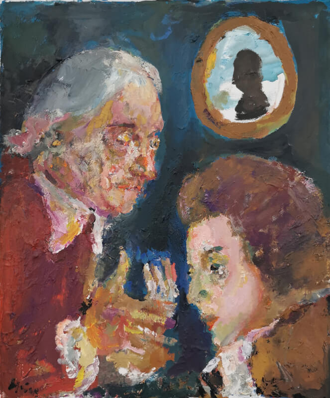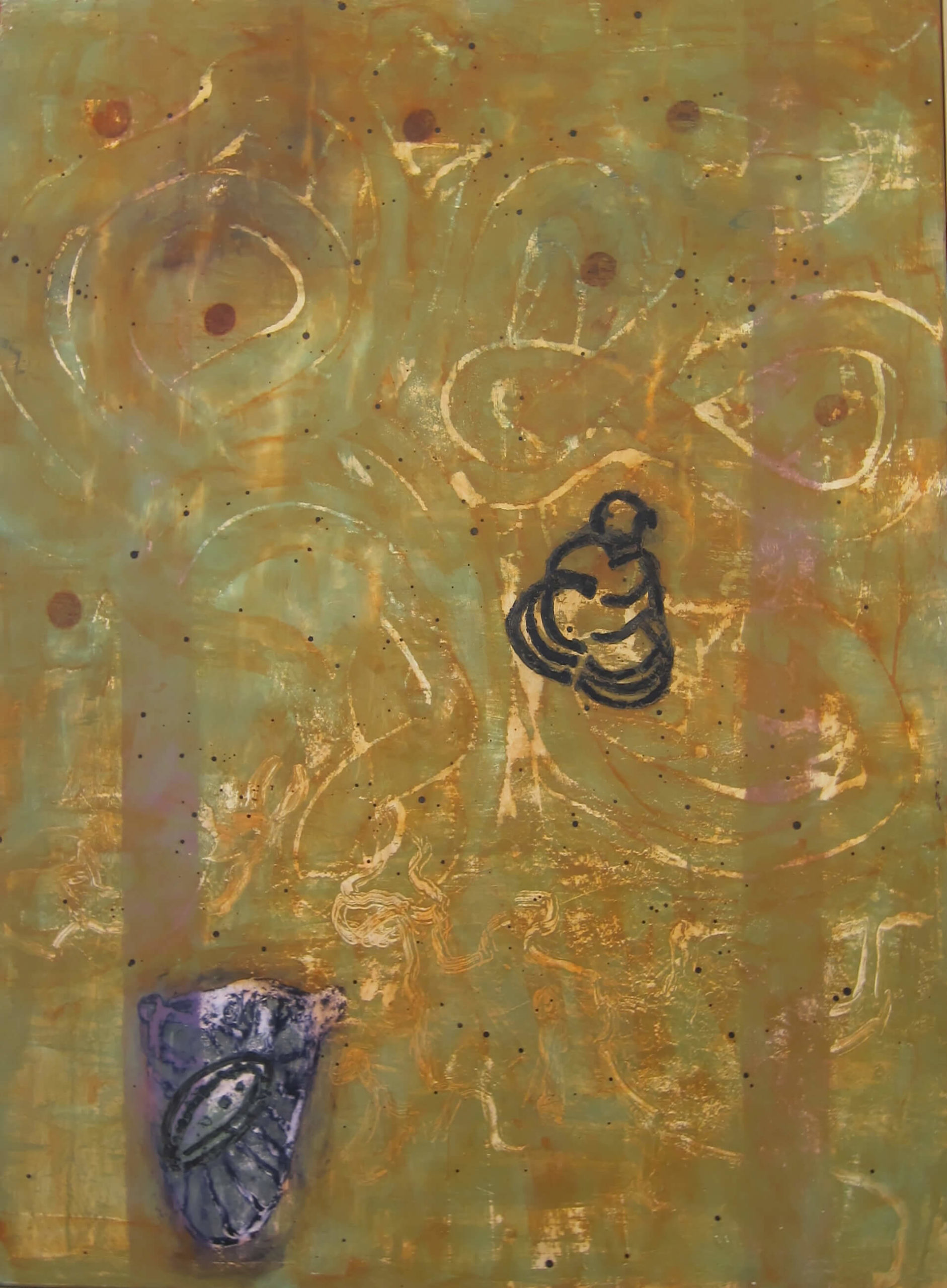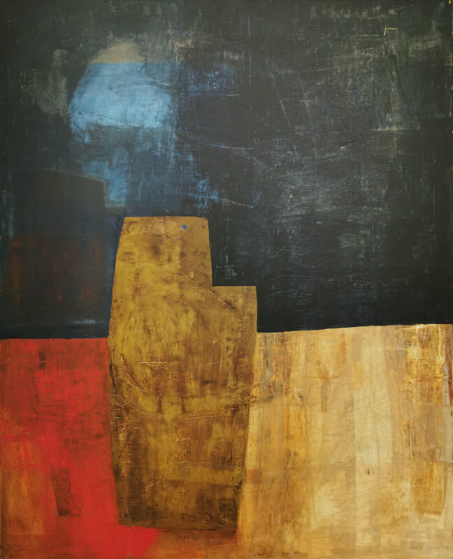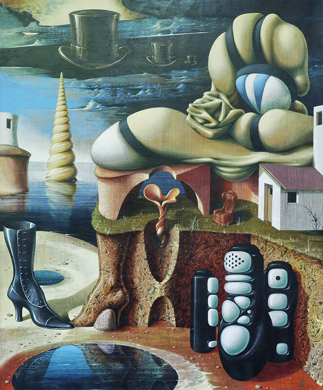Glasobjekt | Leinwand in Holz mit Schutz aus Plexiglas mit 7 Fischen in glas eingebunden, Leinwand weiß und azur, Glas blau mit Rauch in opal Format: cm