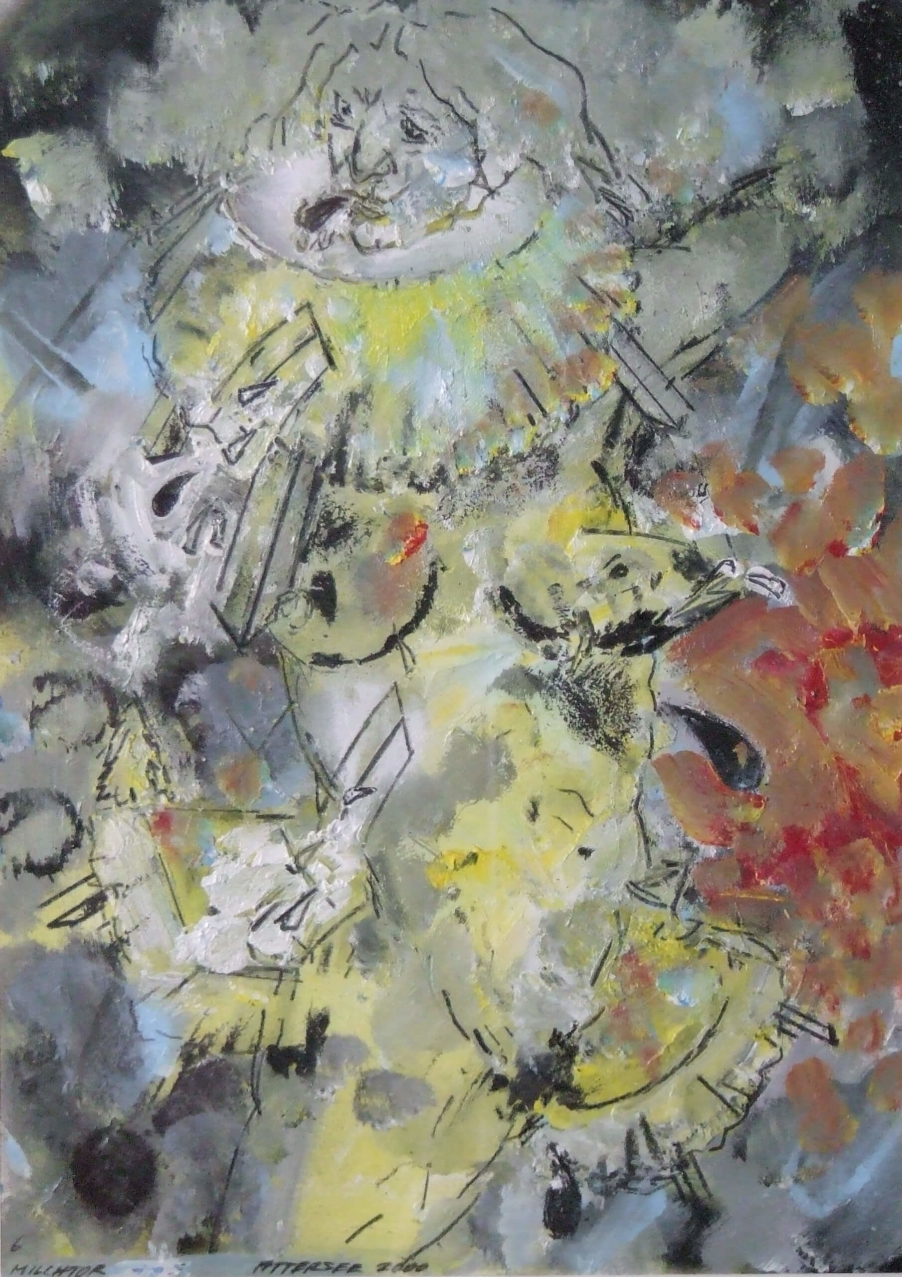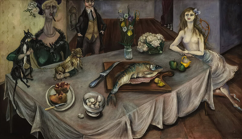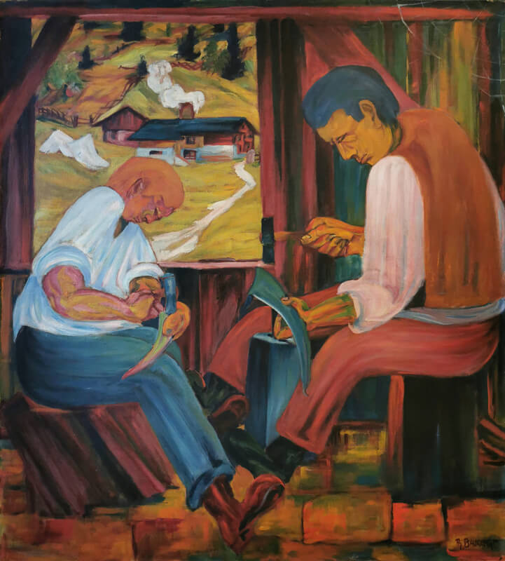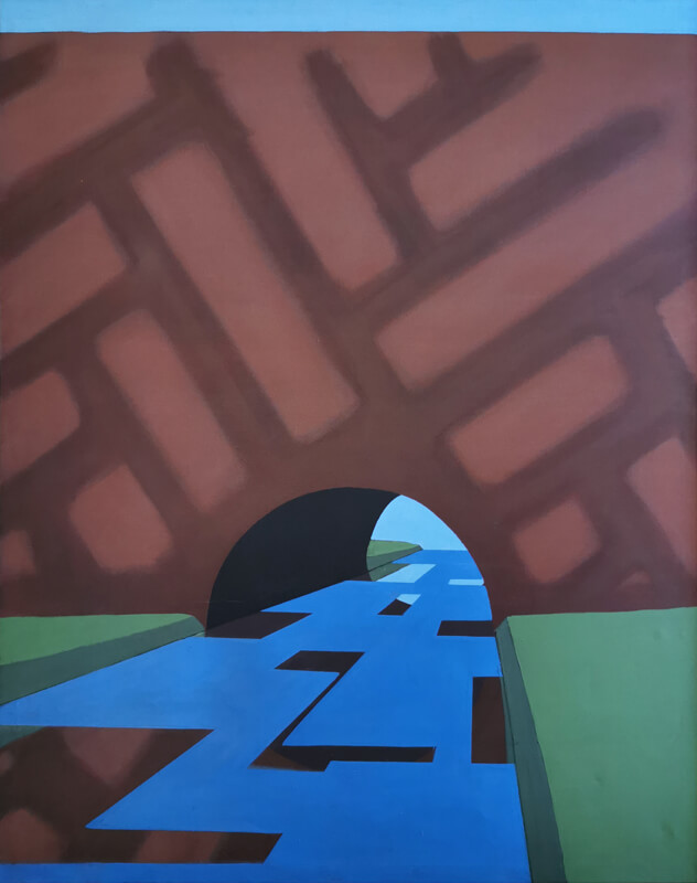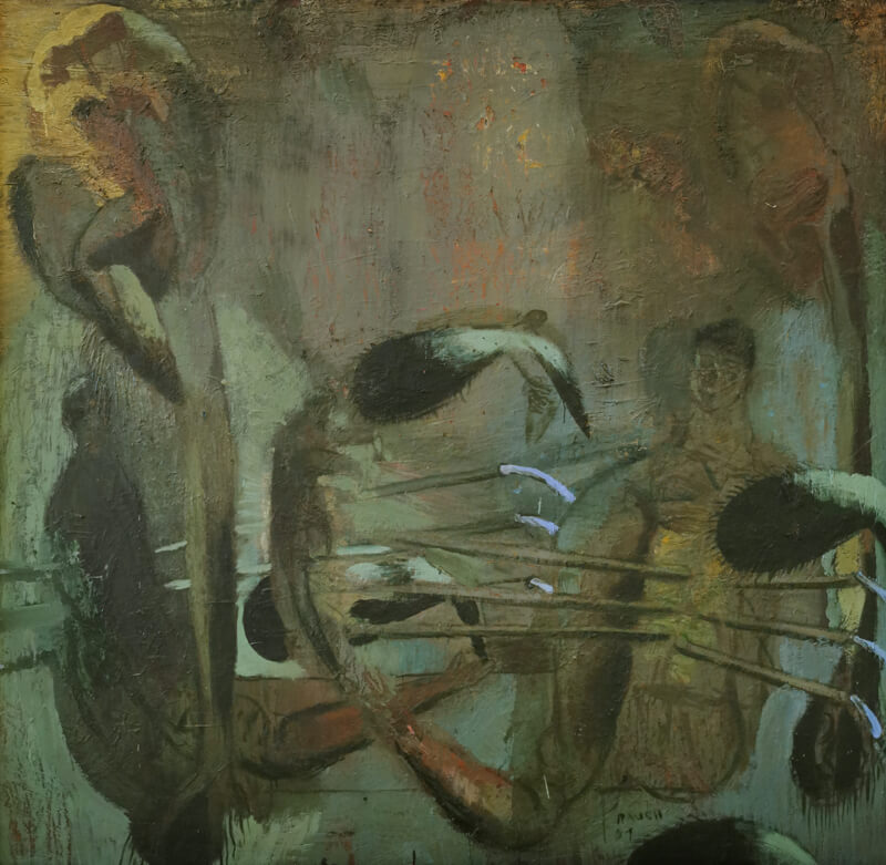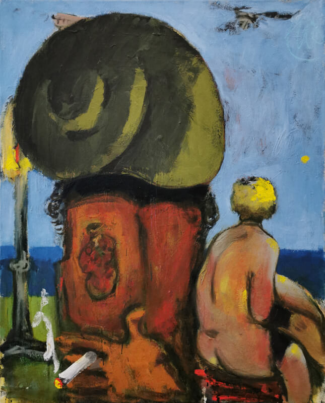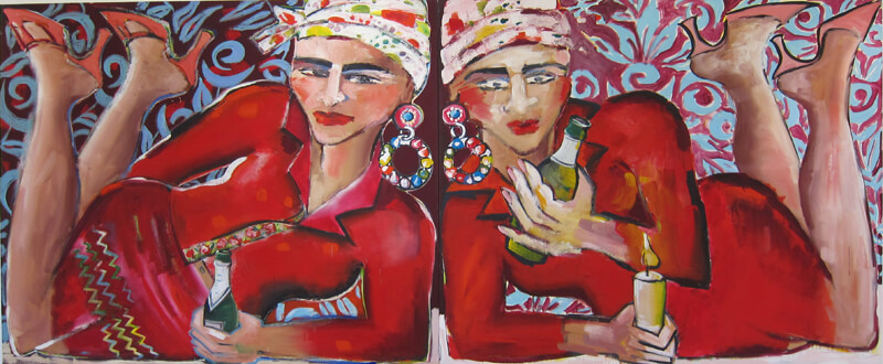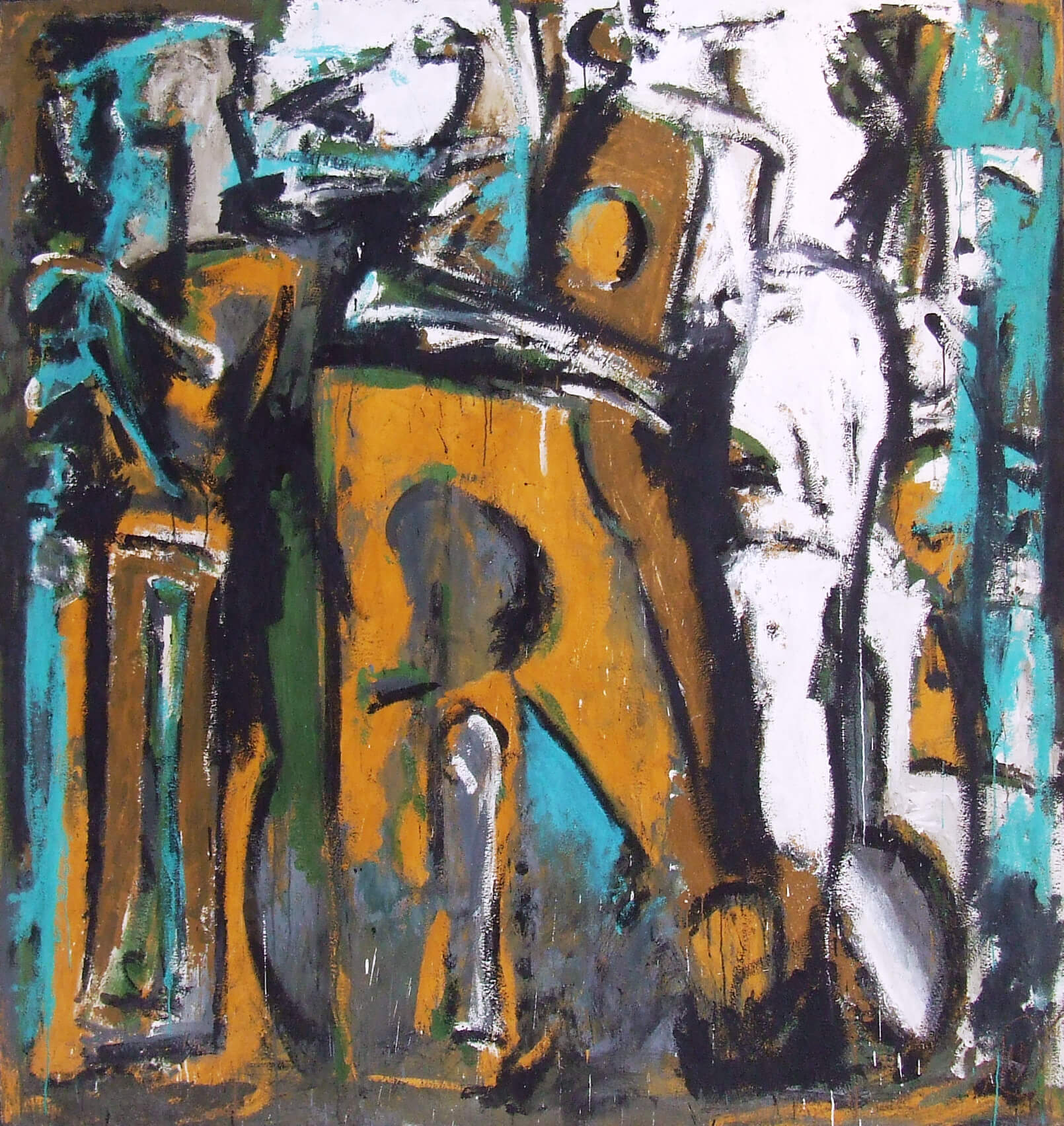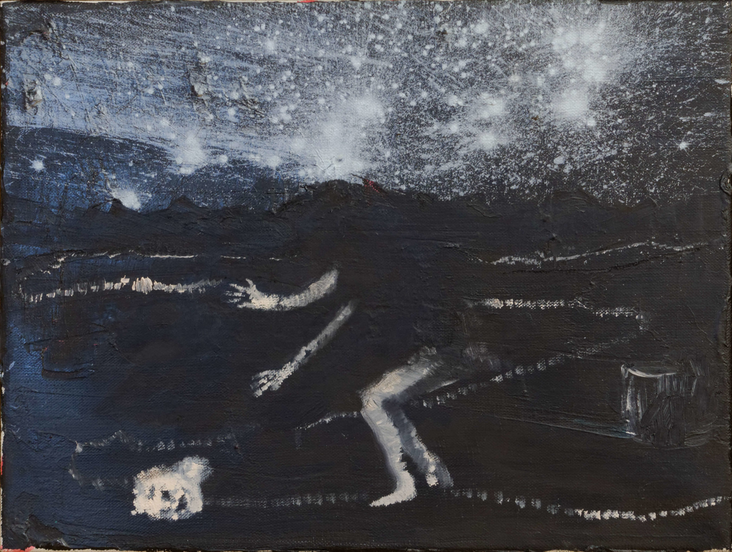 Glasobjekt | Leinwand in Holz mit Schutz aus Plexiglas mit 7 Fischen in glas eingebunden, Leinwand weiß und azur, Glas blau mit Rauch in opal Format: cm