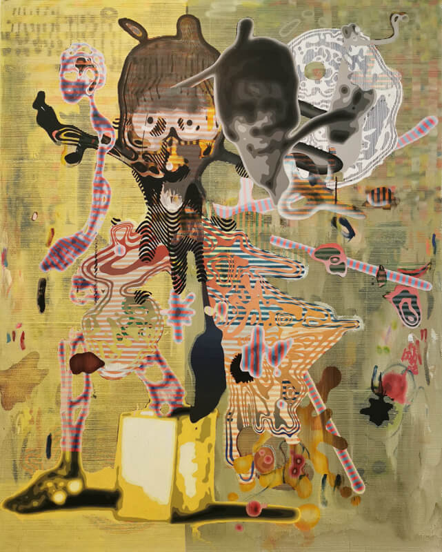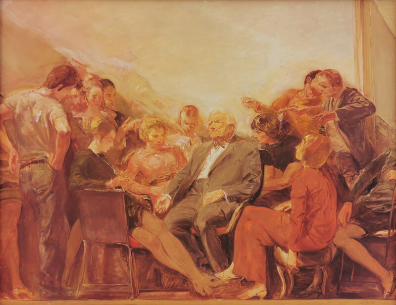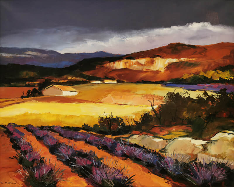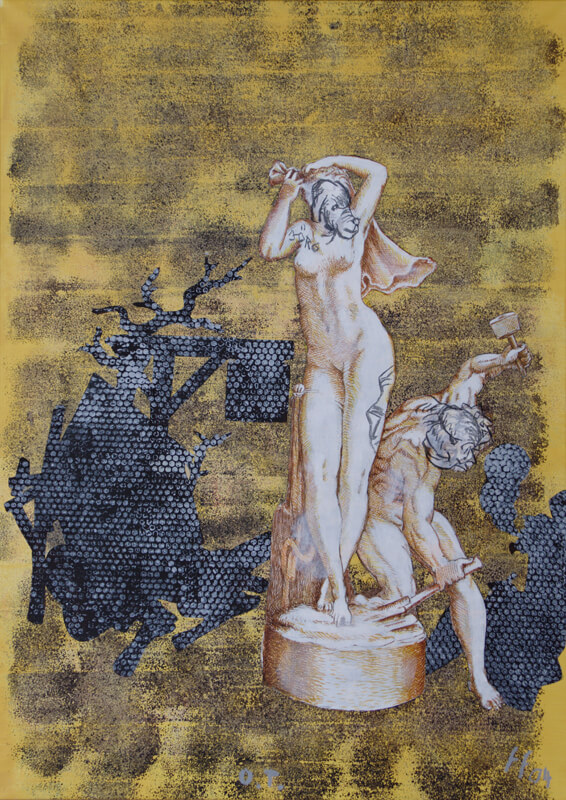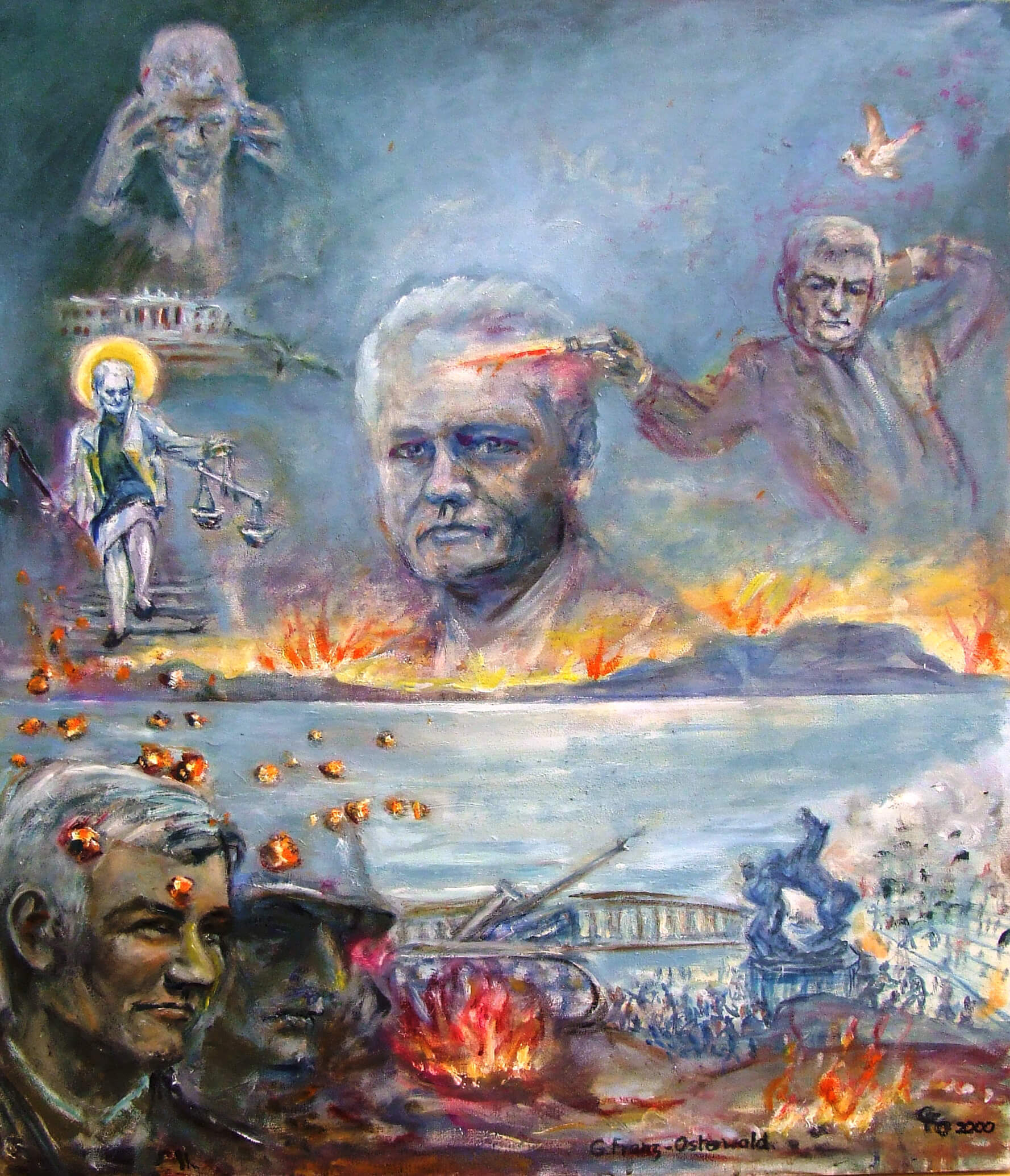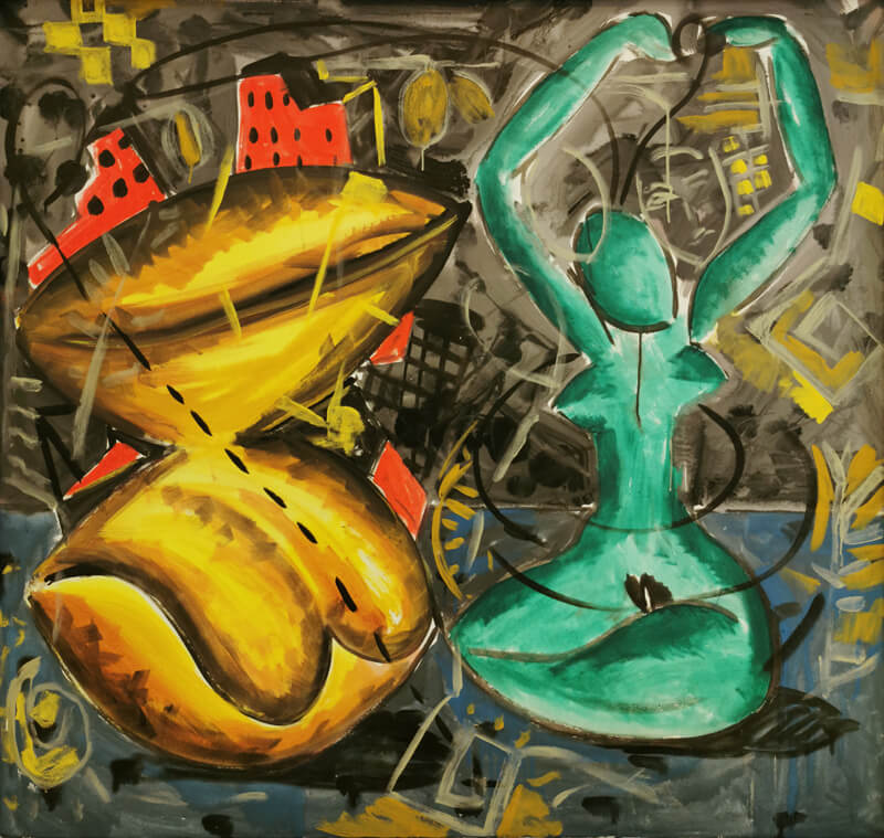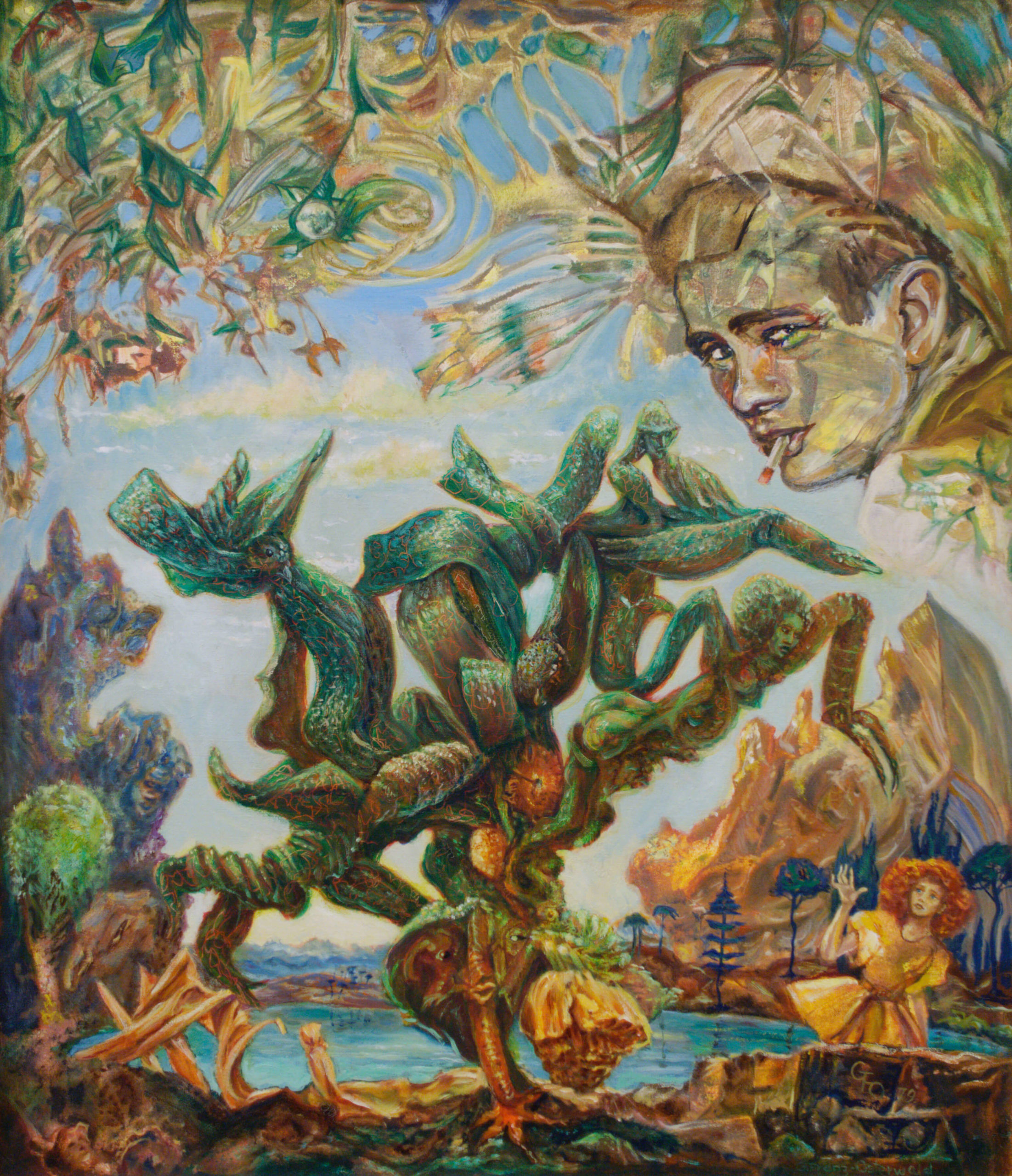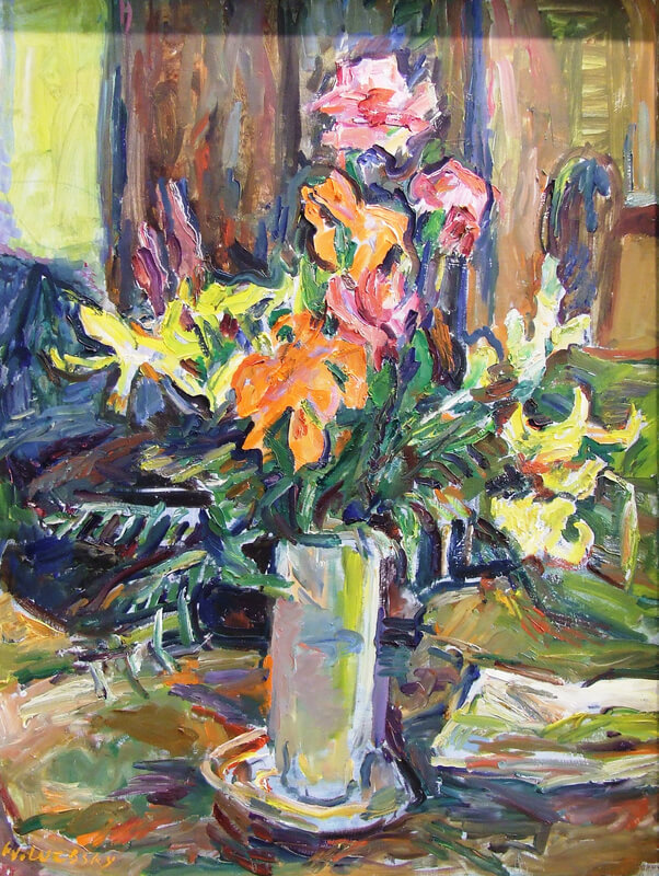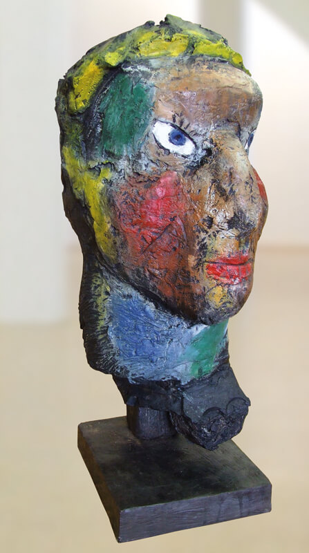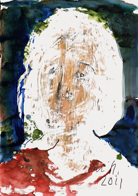 Glasobjekt | Leinwand in Holz mit Schutz aus Plexiglas mit 7 Fischen in glas eingebunden, Leinwand weiß und azur, Glas blau mit Rauch in opal Format: cm