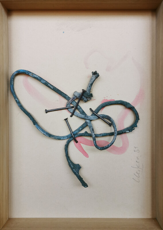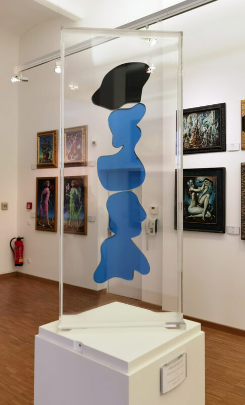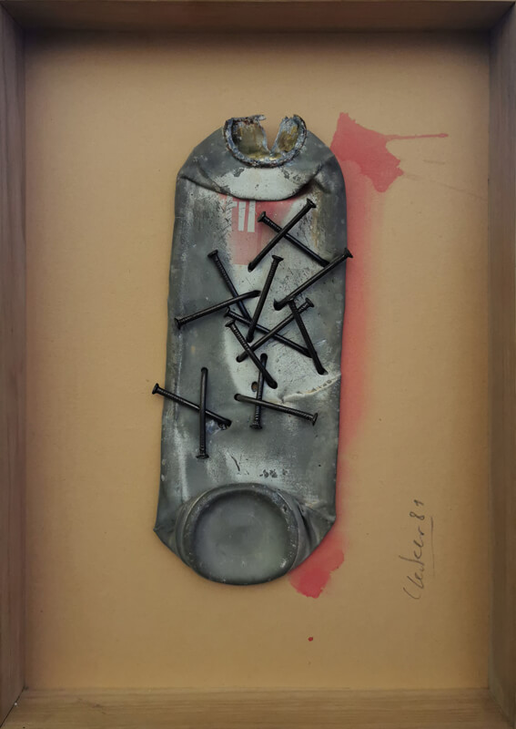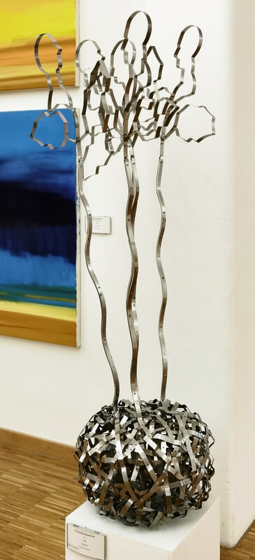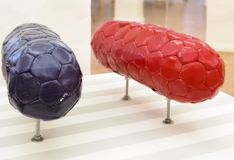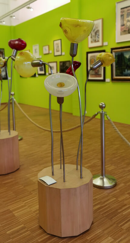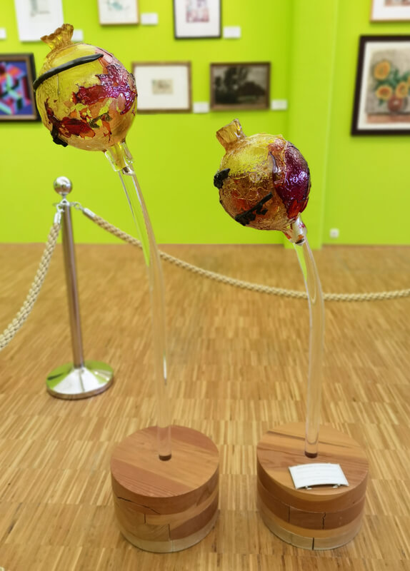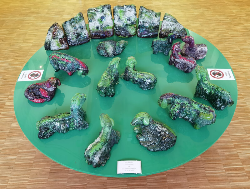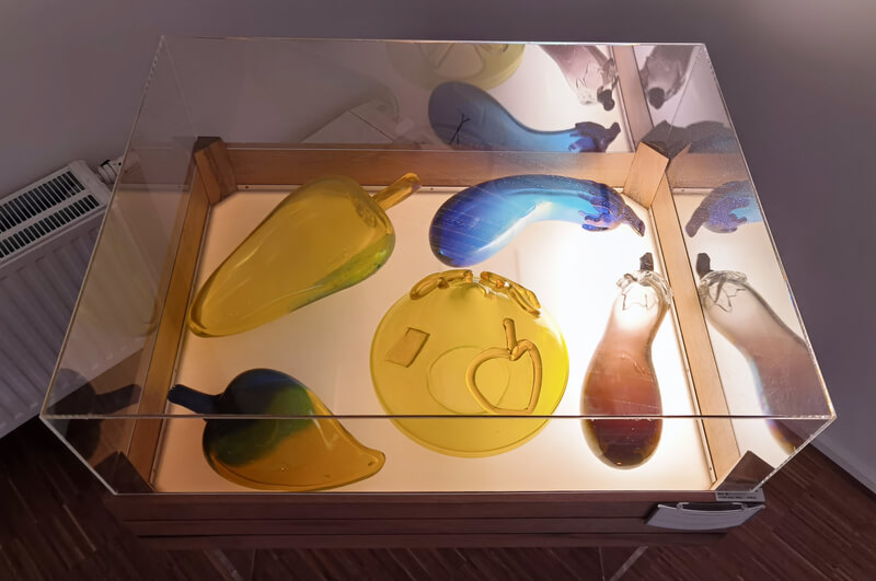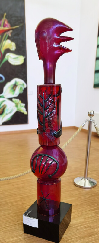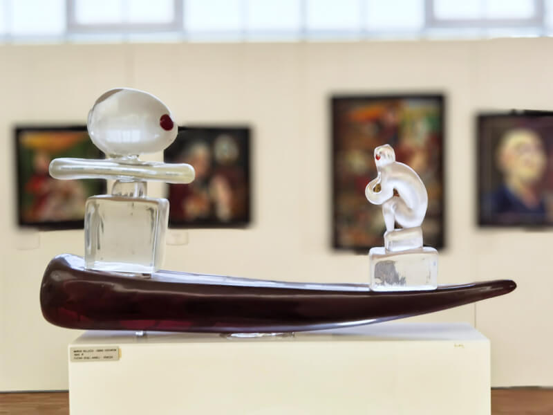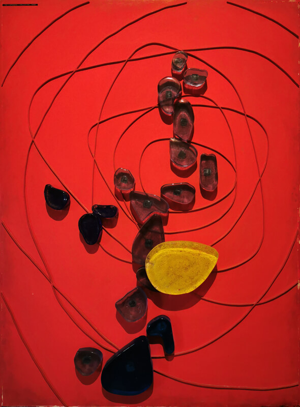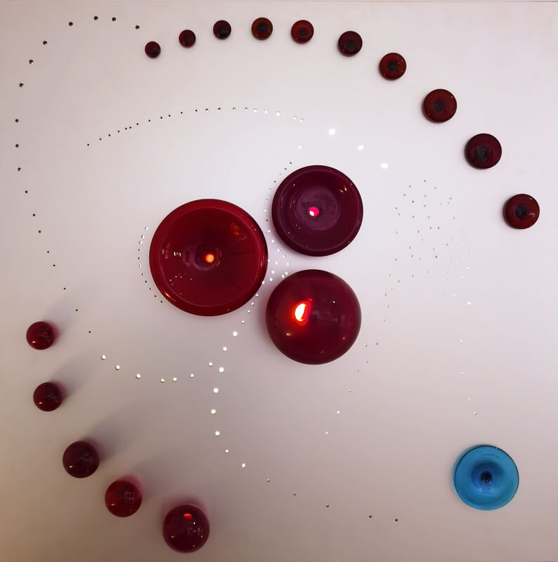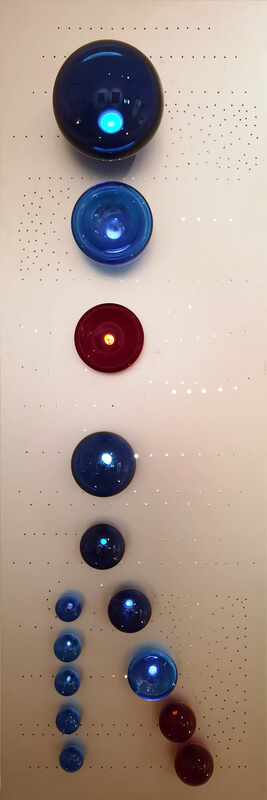 Glasobjekt | Leinwand rechtwinklig in Eisen (silber) mit einer Reihe Öffnungen, um das Licht durchzulassen + 11 Kugeln aus verschiedenen Maßen und 3 Becher mit verschiedenen Maßen, rot, aquamarin Format: cm