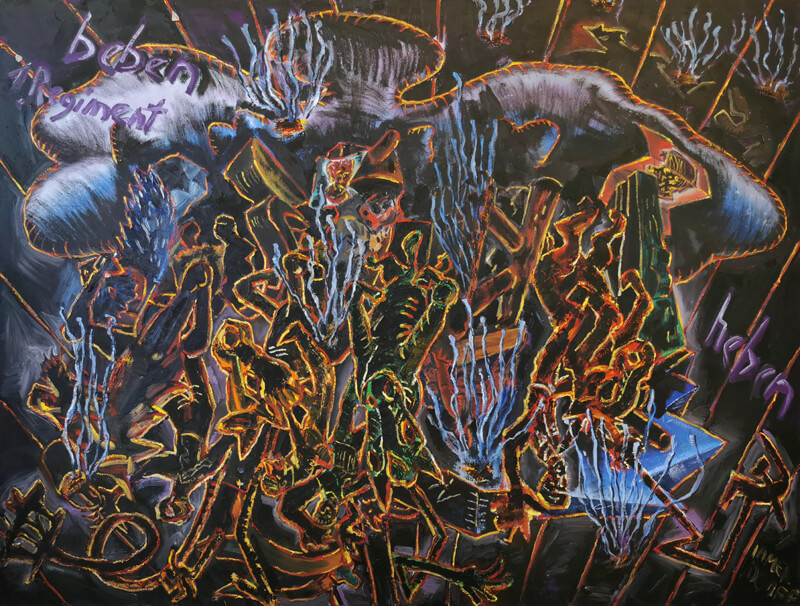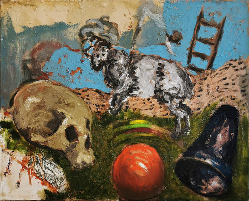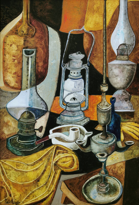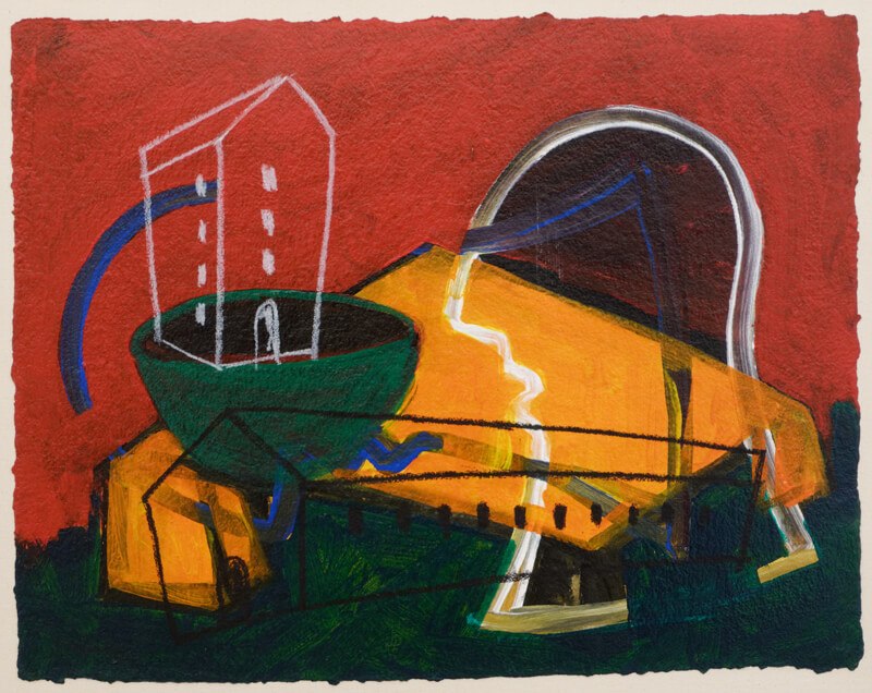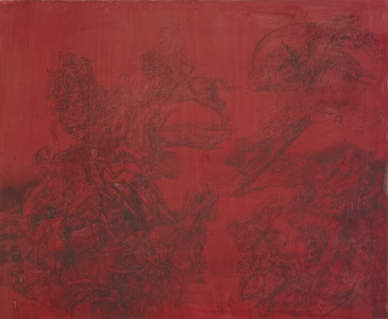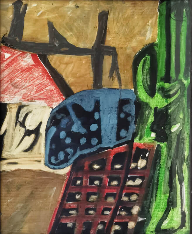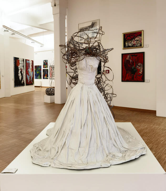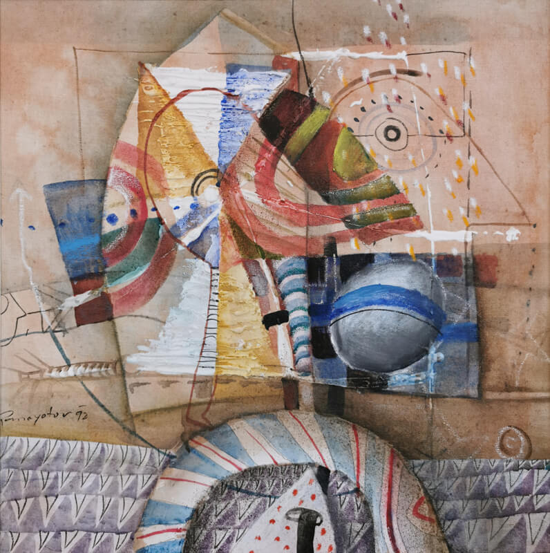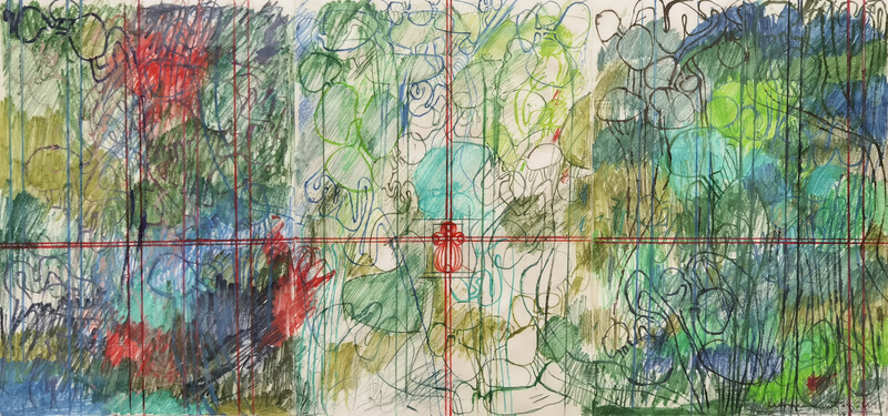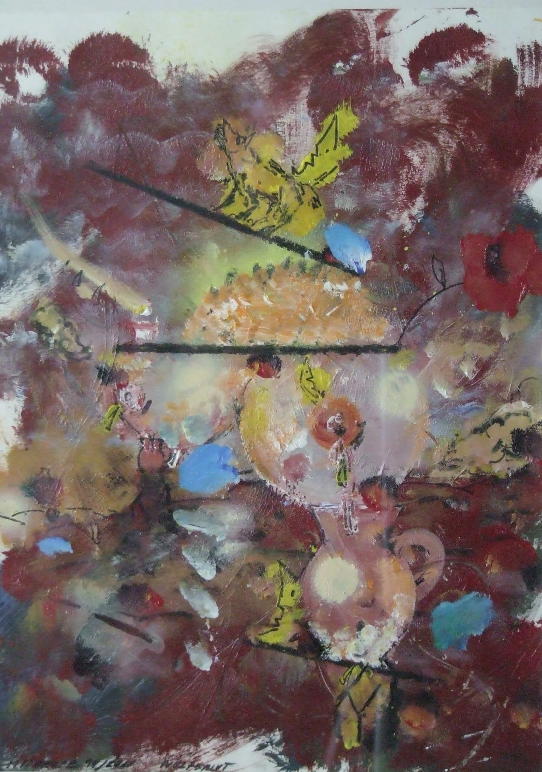 Glasobjekt | Leinwand rechtwinklig in Eisen (silber) mit einer Reihe Öffnungen, um das Licht durchzulassen + 11 Kugeln aus verschiedenen Maßen und 3 Becher mit verschiedenen Maßen, rot, aquamarin Format: cm